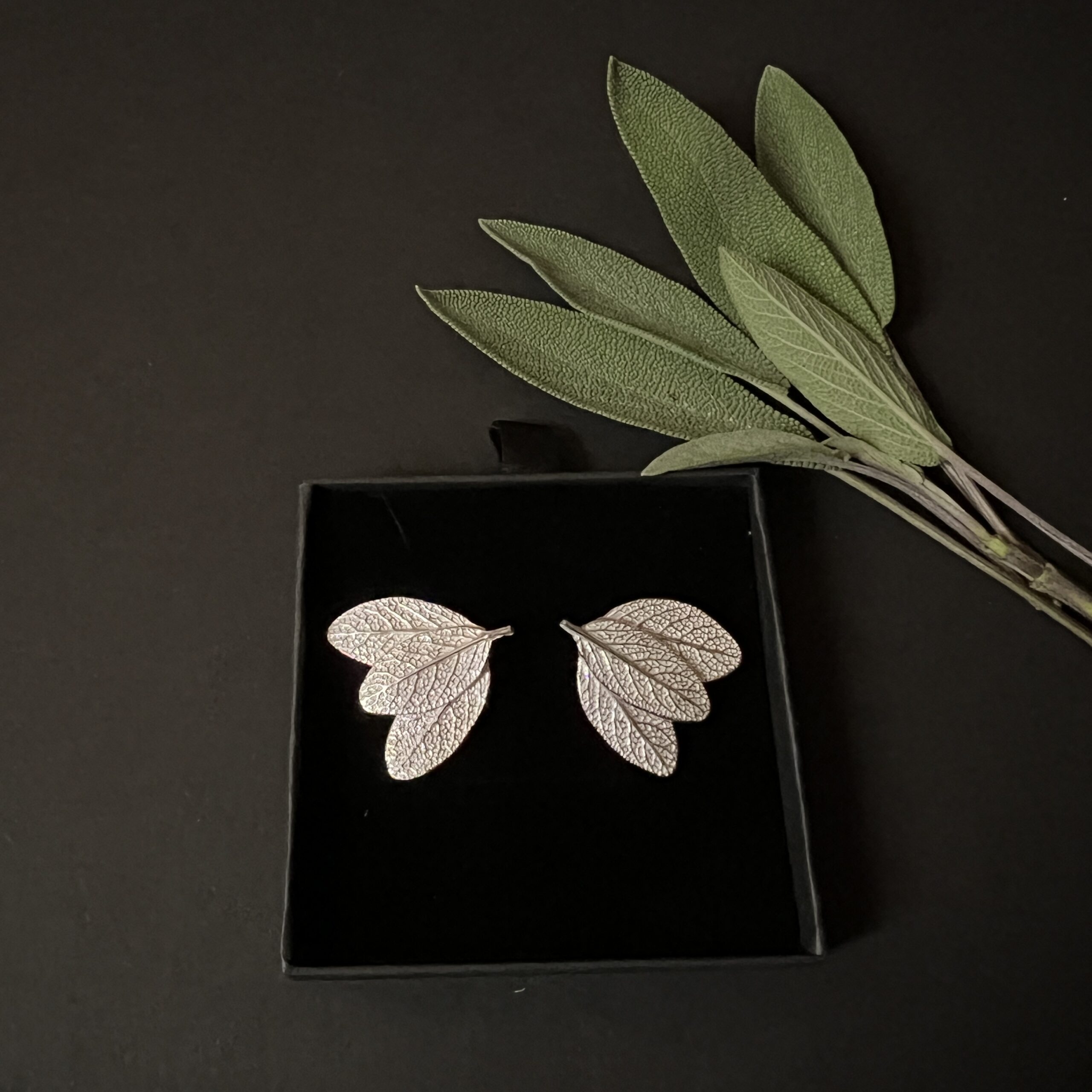 Répliques de feuilles de sauge officinale en argent 925. Les boucles se portent de manière à inspirer de petites ailes végétales prêtes à disséminer poésie et fantaisie à vos oreilles. Pour cet effet, veillez à porter la boucle adéquate à la bonne oreille (voir photo).