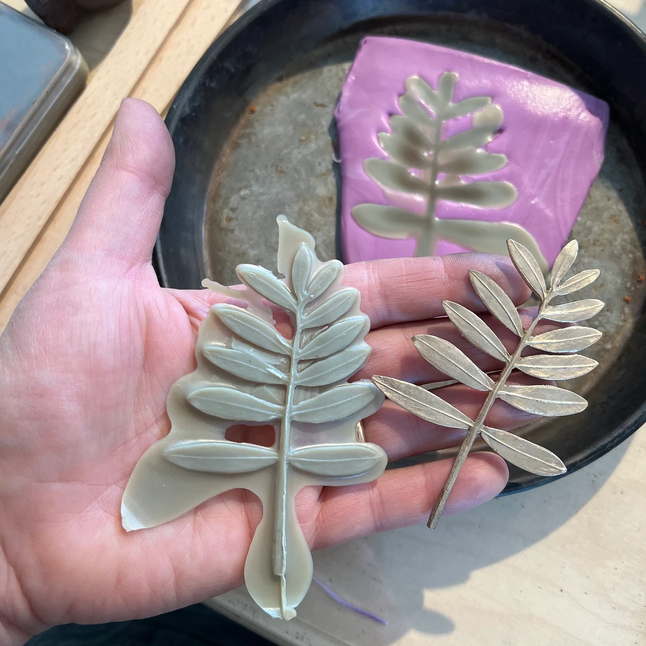 Un moulage de la feuille est réalisé en cire. Une fois retravaillée et sculptée afin de se rapprocher le plus fidèlement possible de son modèle originel, la feuille en cire est ensuite placée sur une tige , elle-même en cire. Cette tige de support appelée « tige de coulée » est placée sur un socle. Le procédé de la cire perdue peut alors débuter.