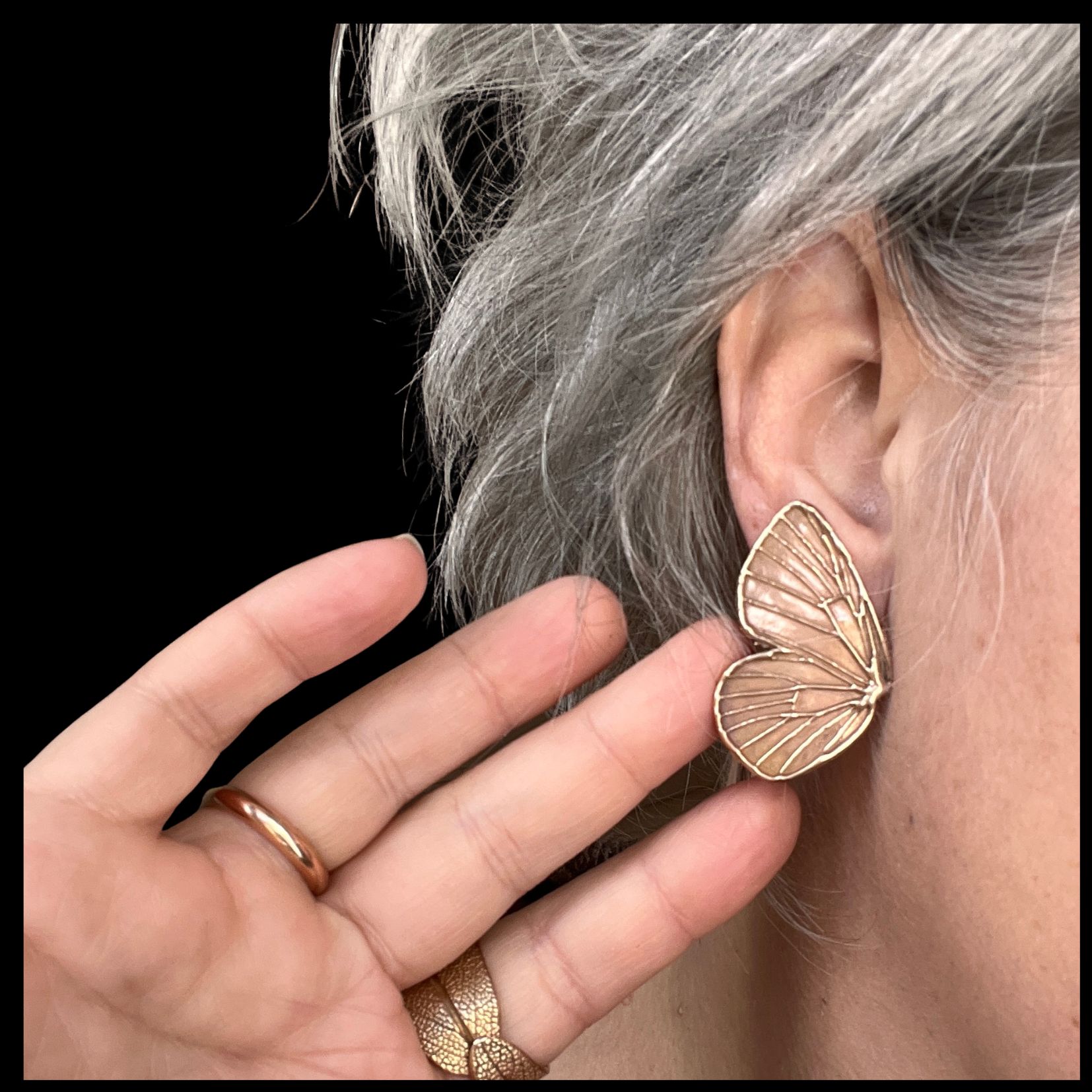 Ailes de papillon, finement sculptées en bronze d’art et soudées sur des clous d’oreilles en argent 925.