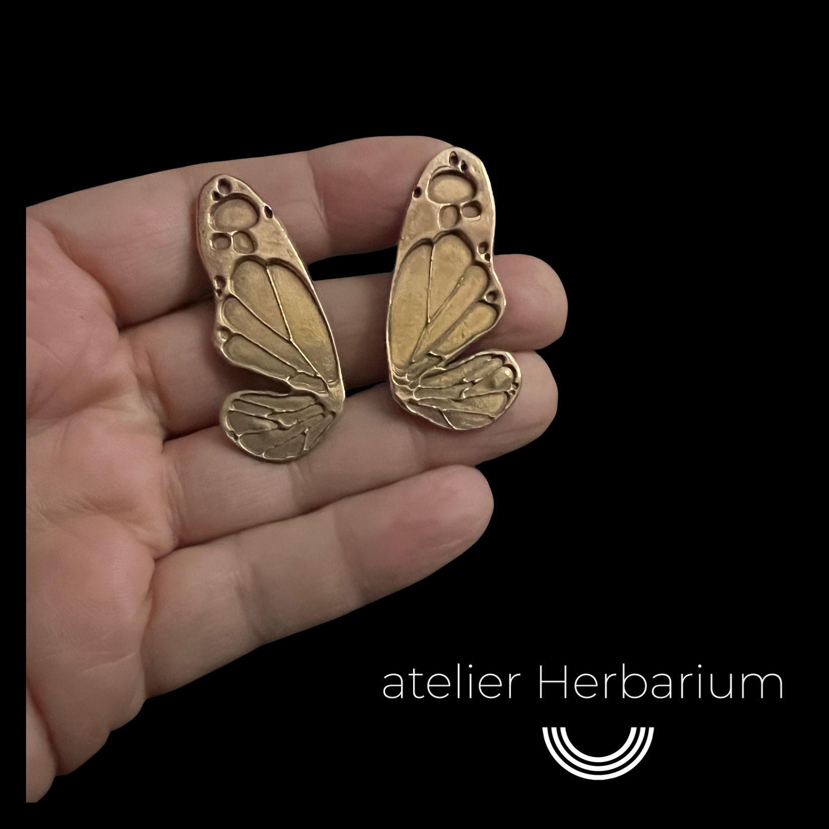 Ailes de papillon, finement sculptées en bronze d’art et soudées sur des clous d’oreilles en argent 925.