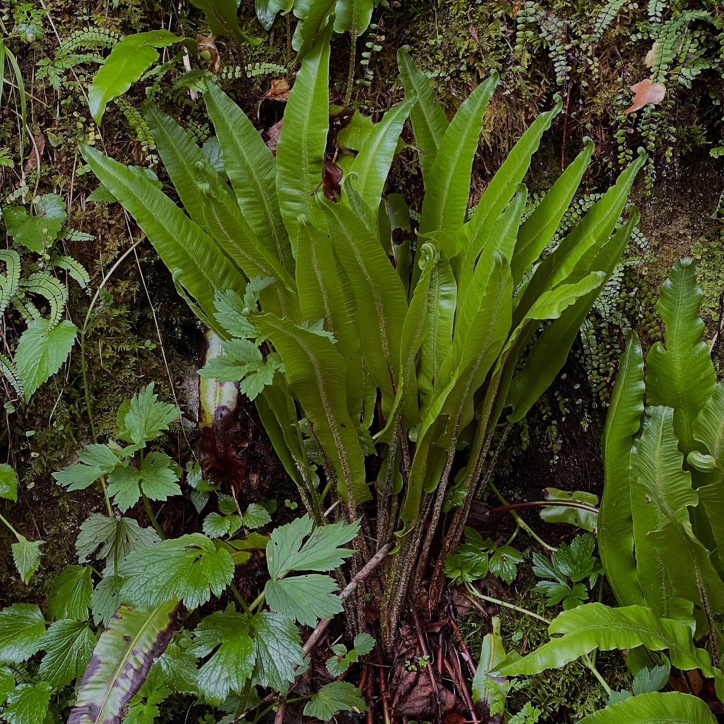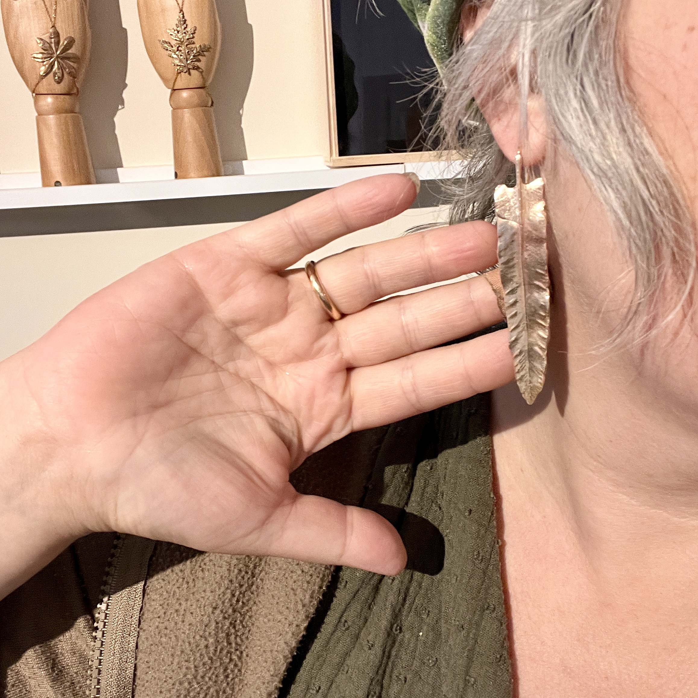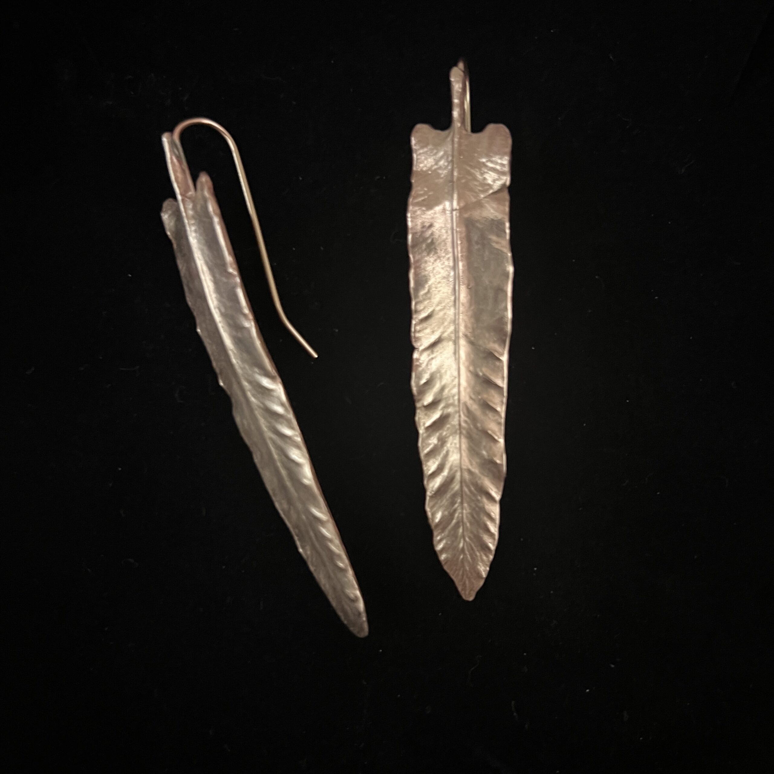 Répliques de feuilles de fougère “langue de cerf”. Boucles d’oreilles-berceuses entièrement en bronze d’art.