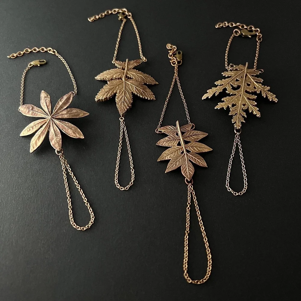 Répliques d’une foliole de Reine des prés en bronze massif, montées sur une chaînette réglable également en bronze doré.
