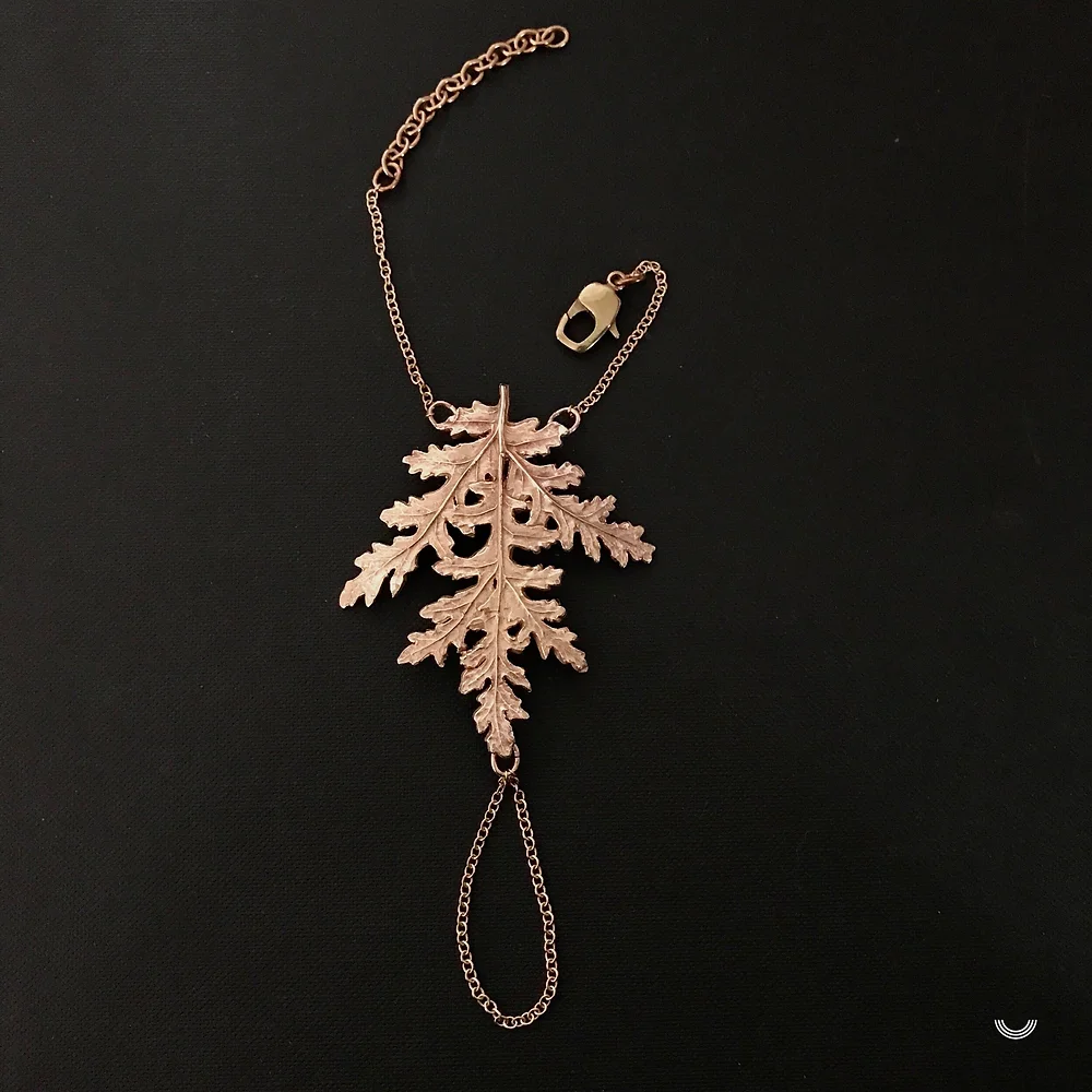 Réplique d’une feuille de phacélie en bronze ou en argent 925 montée sur une chaînette fine réglable.