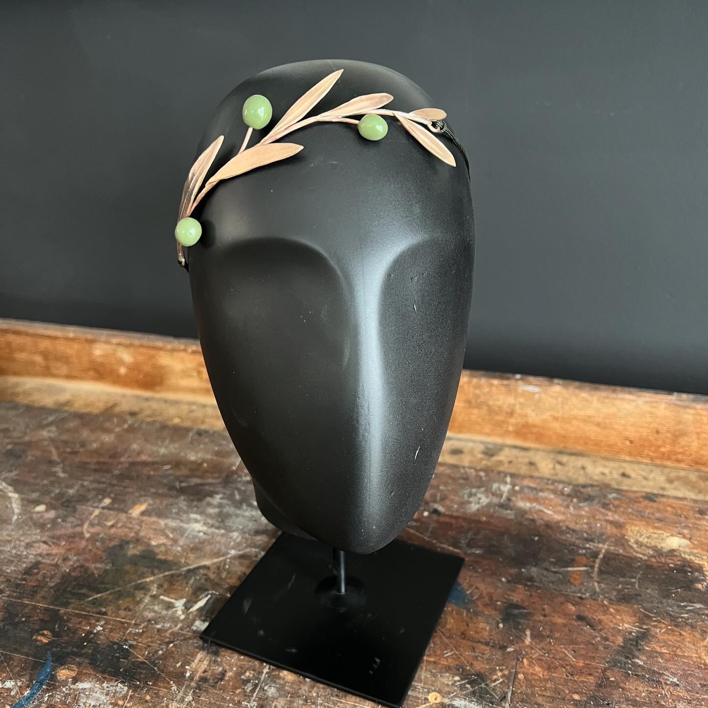 L’olivier, une essence ancestrale et mythologique incarnée dans ce bijou de tête composé de répliques en bronze d’Art de feuilles d’Olivier et d’olives en pâte de verre. Alliant la force du bronze à la délicatesse du verre, ce collier-torque raconte une histoire de tradition et d’artisanat, capturant l’esprit méditerranéen dans un bijou à la fois intemporel et contemporain.