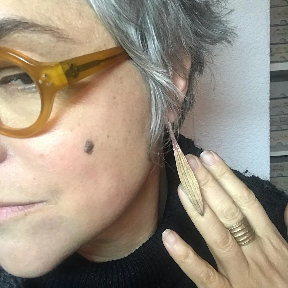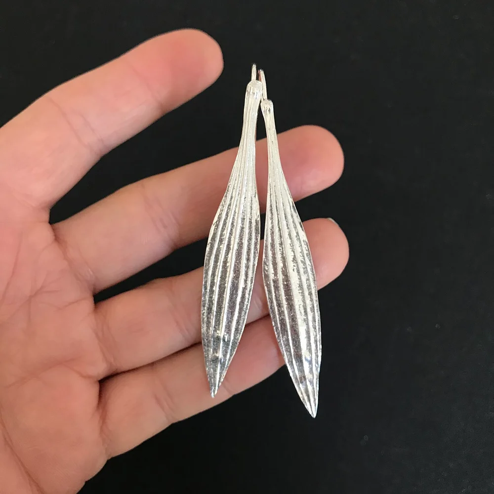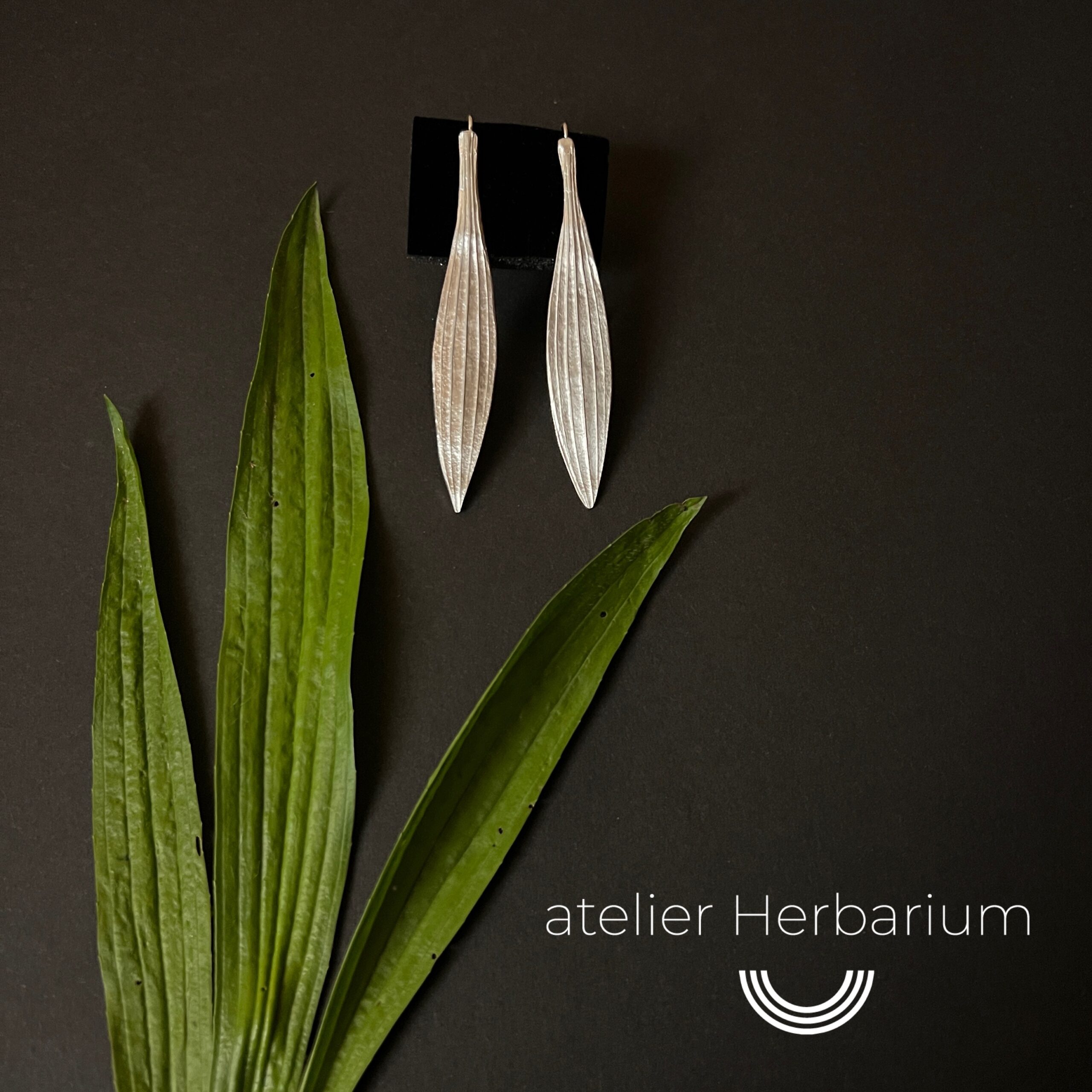 Répliques de feuilles de plantain lancéolé. Boucles d’oreilles-berceuses entièrement en argent 925.