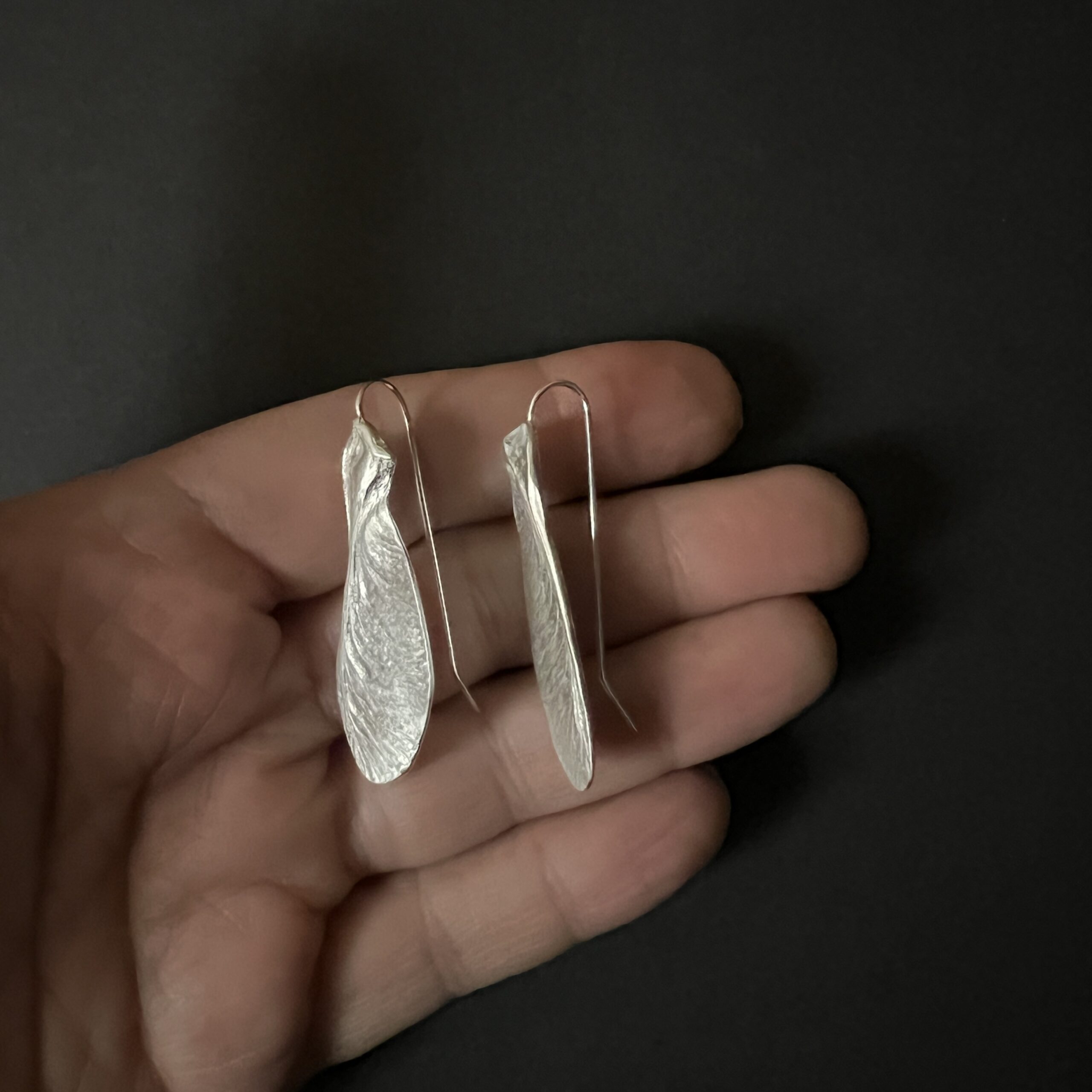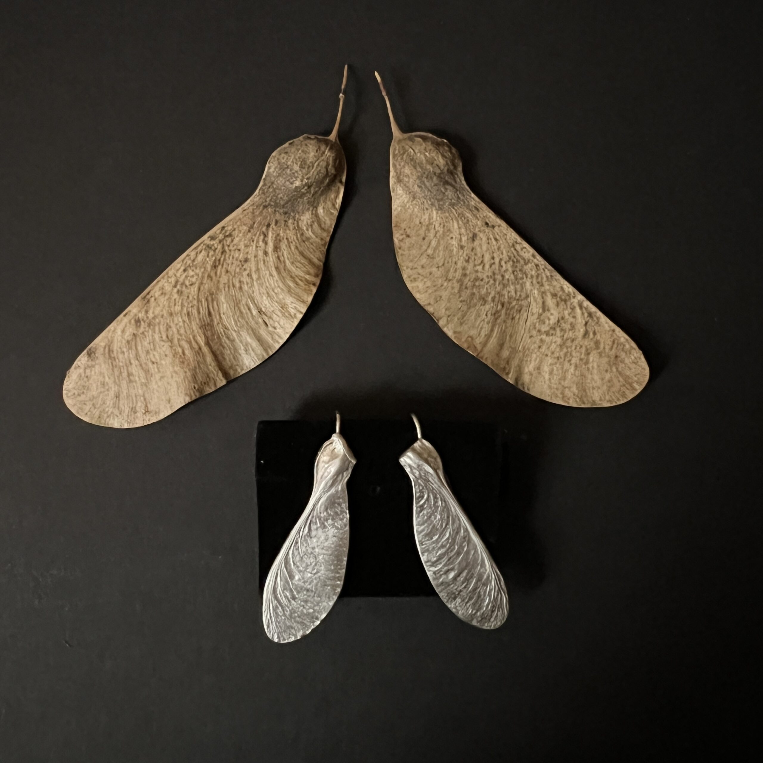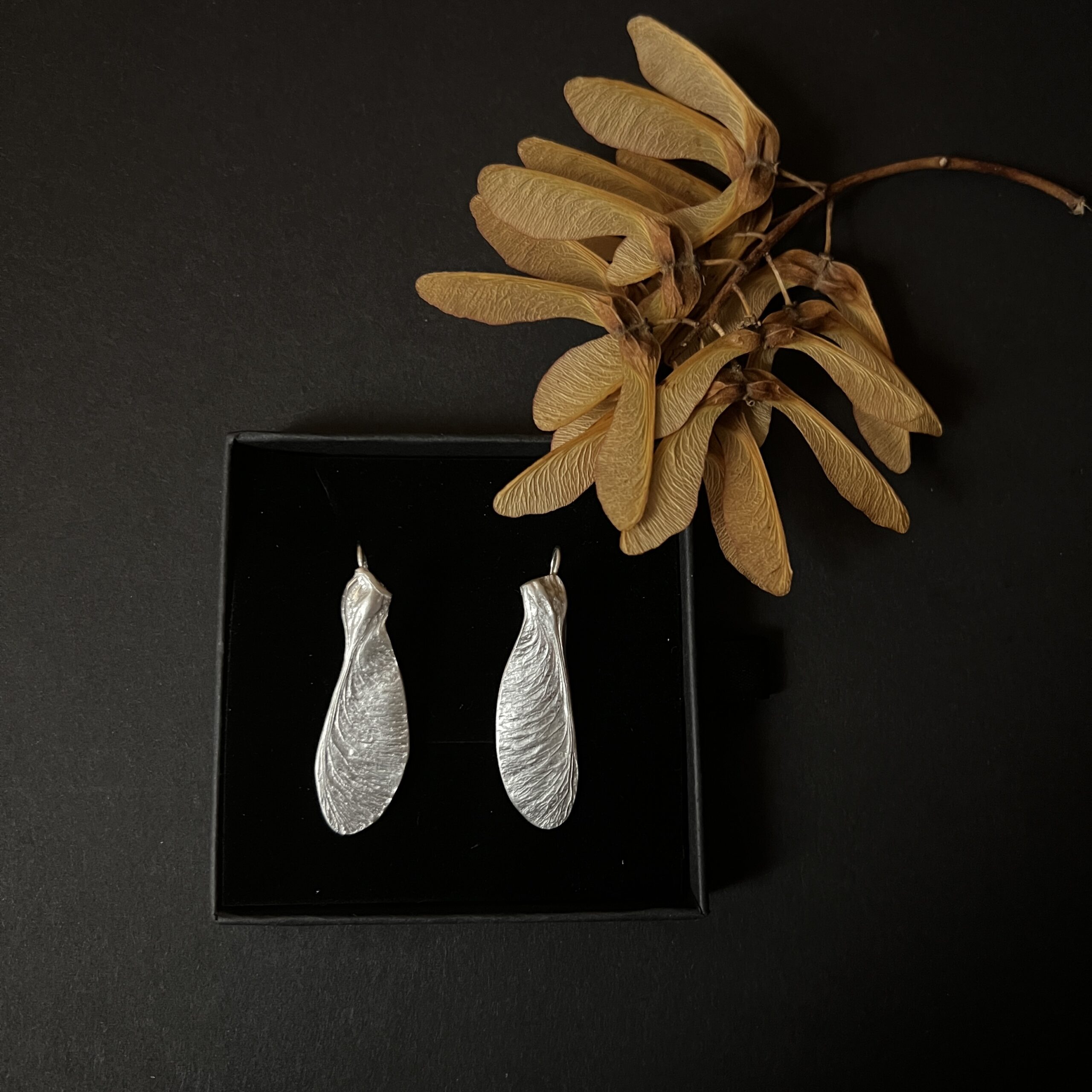 Samares d’érable répliqués en argent 925 pour cette paire de boucles d’oreilles qui se porte de manière à inspirer de petites ailes végétales prêtes à disséminer poésie et fantaisie à vos oreilles.