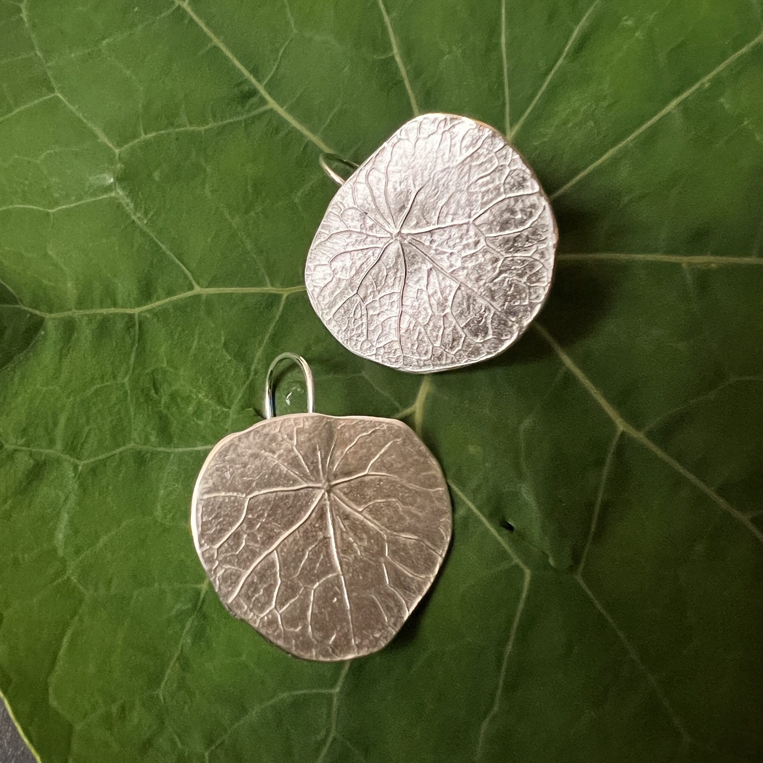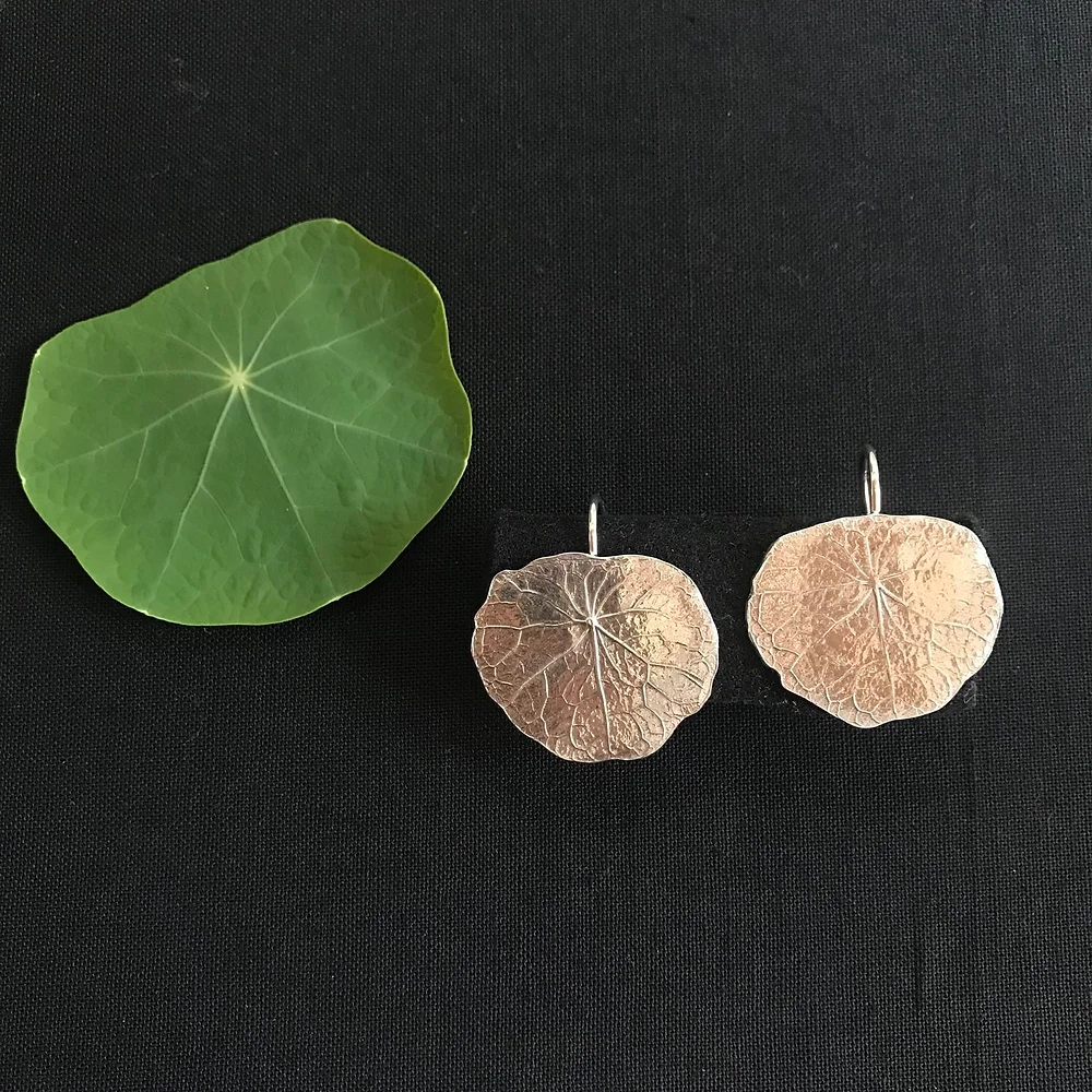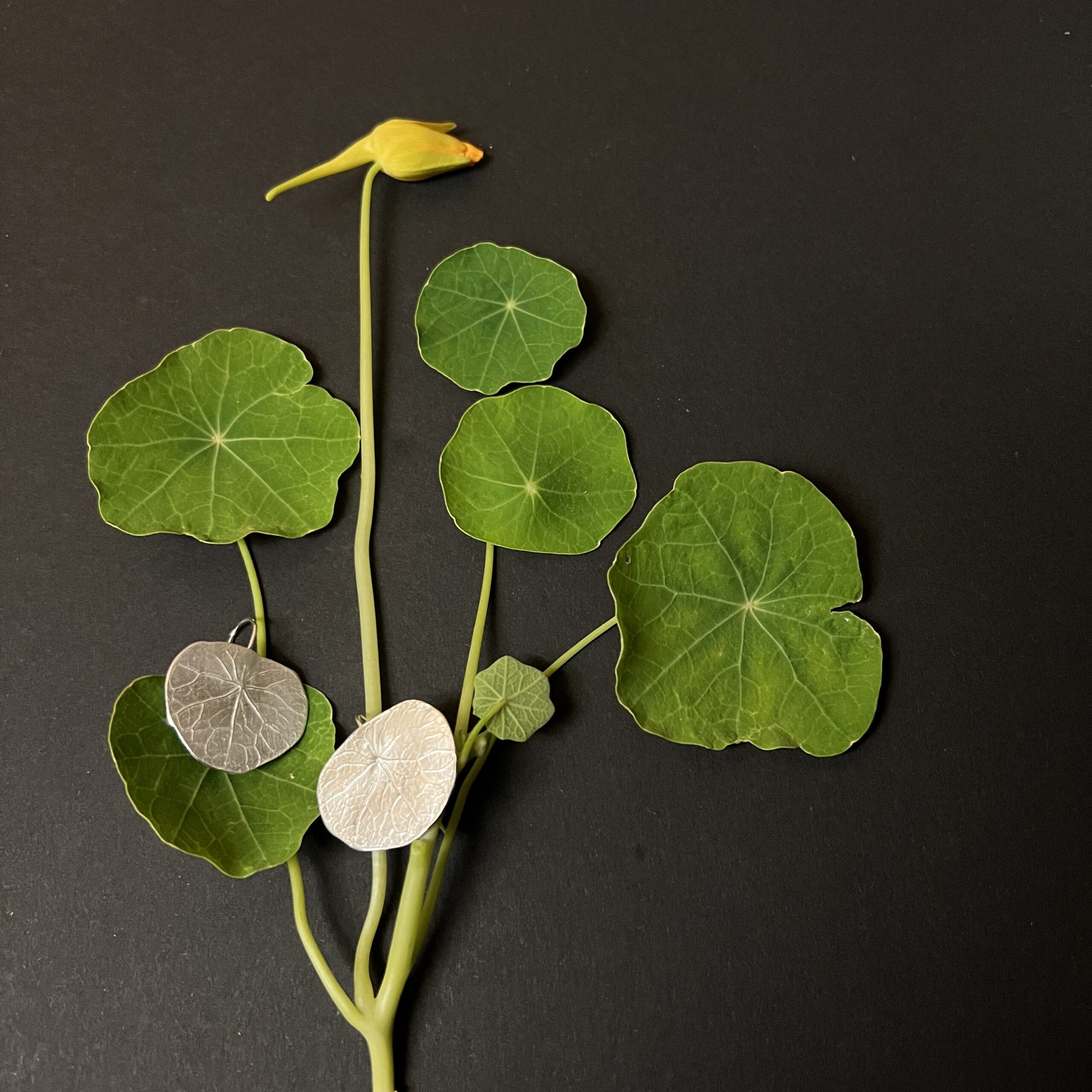 Répliques de feuilles de capucines. Boucles d’oreilles-berceuses entièrement en argent 925.