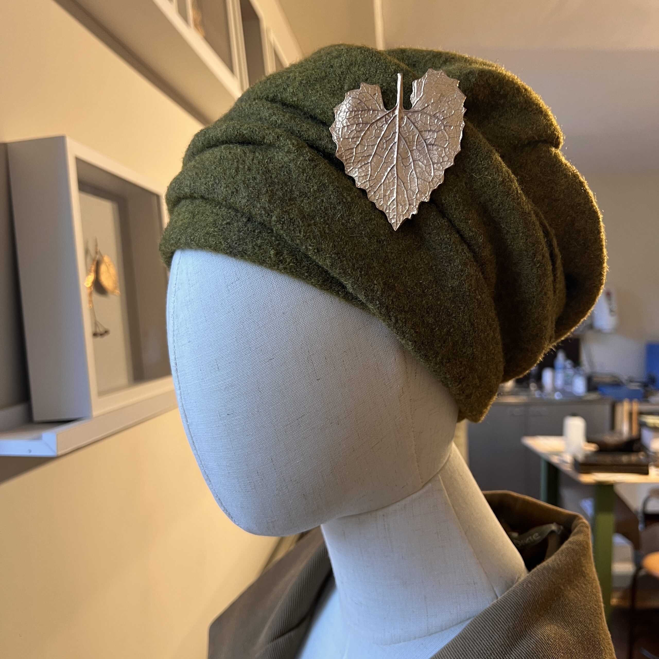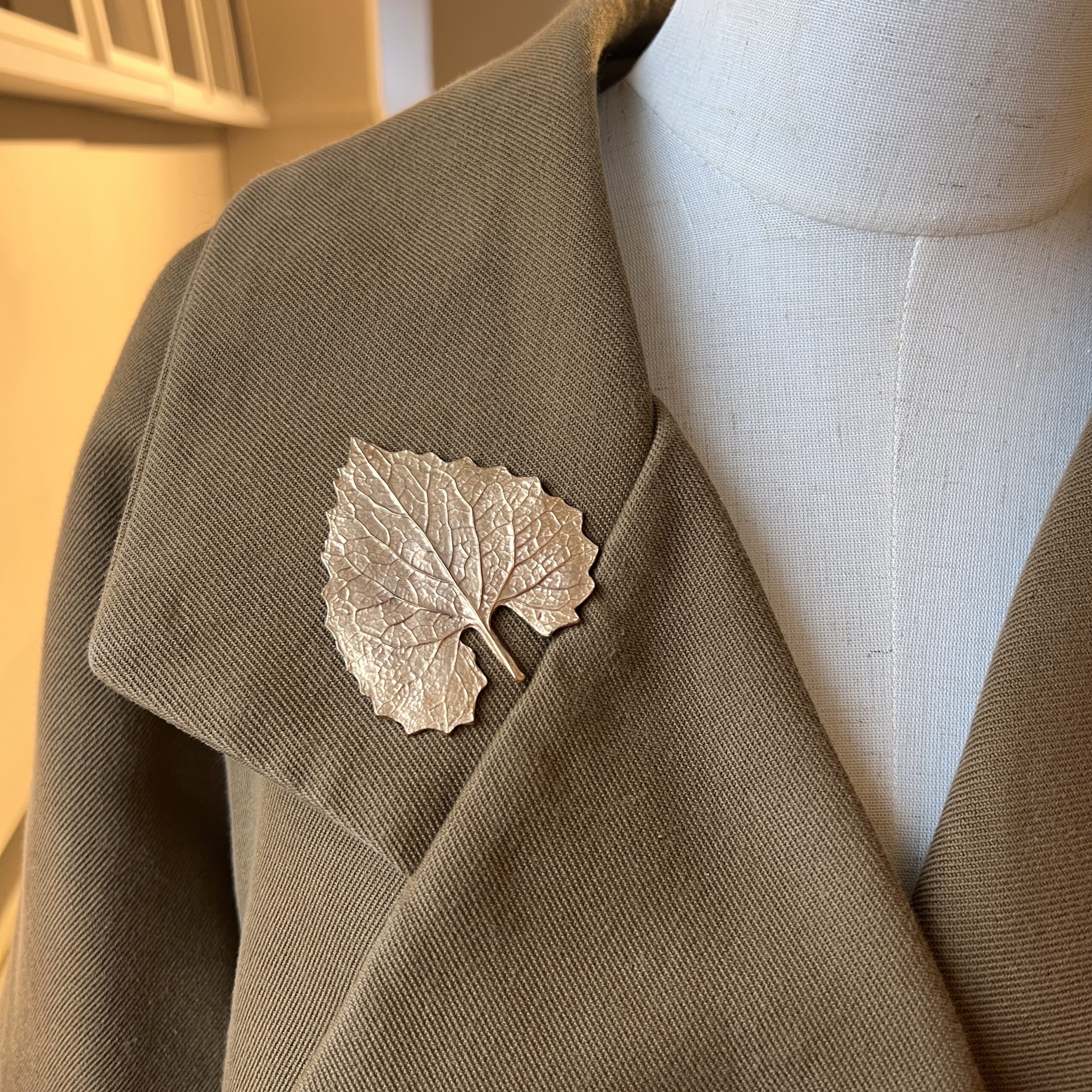 Réplique en bronze d’une feuille d’alliaire officinale soudée sur un support de pin’s.