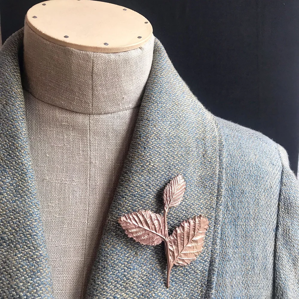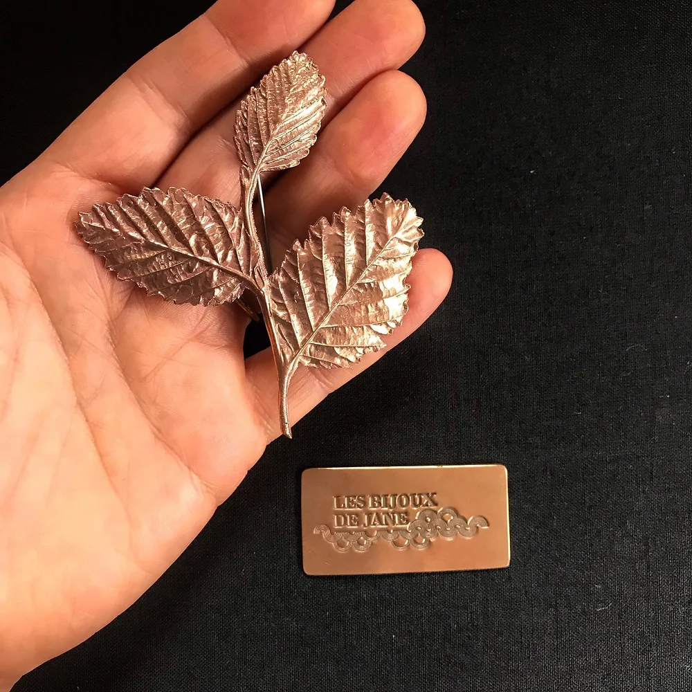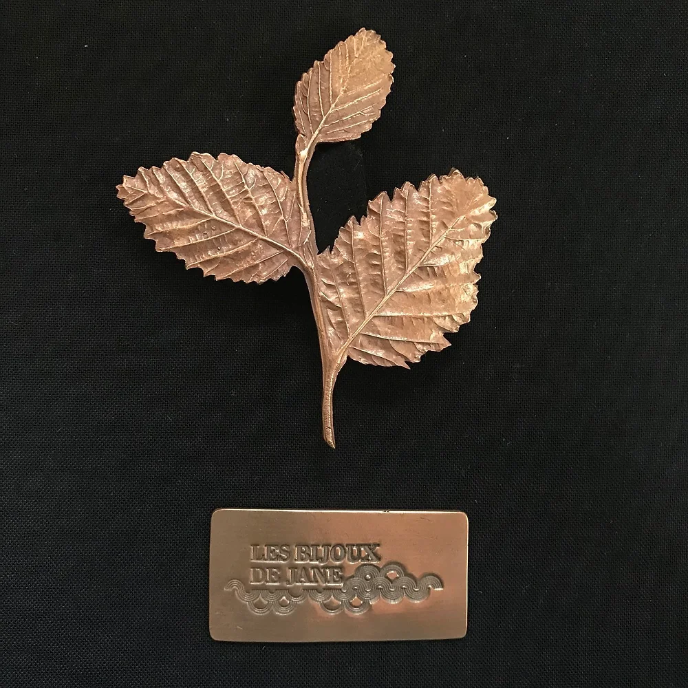 Réplique en bronze d’une branche de charme, montée sur un support de broche.
