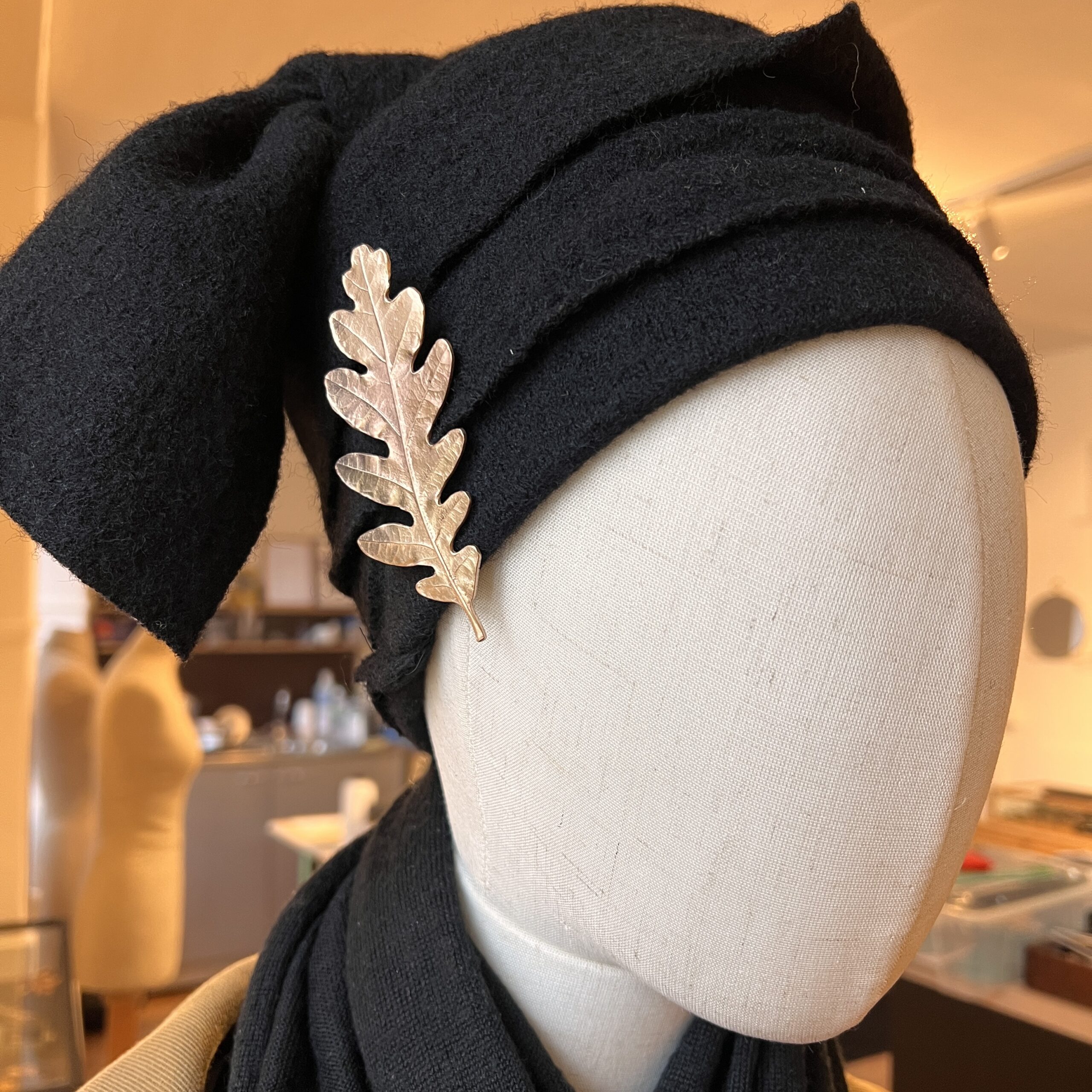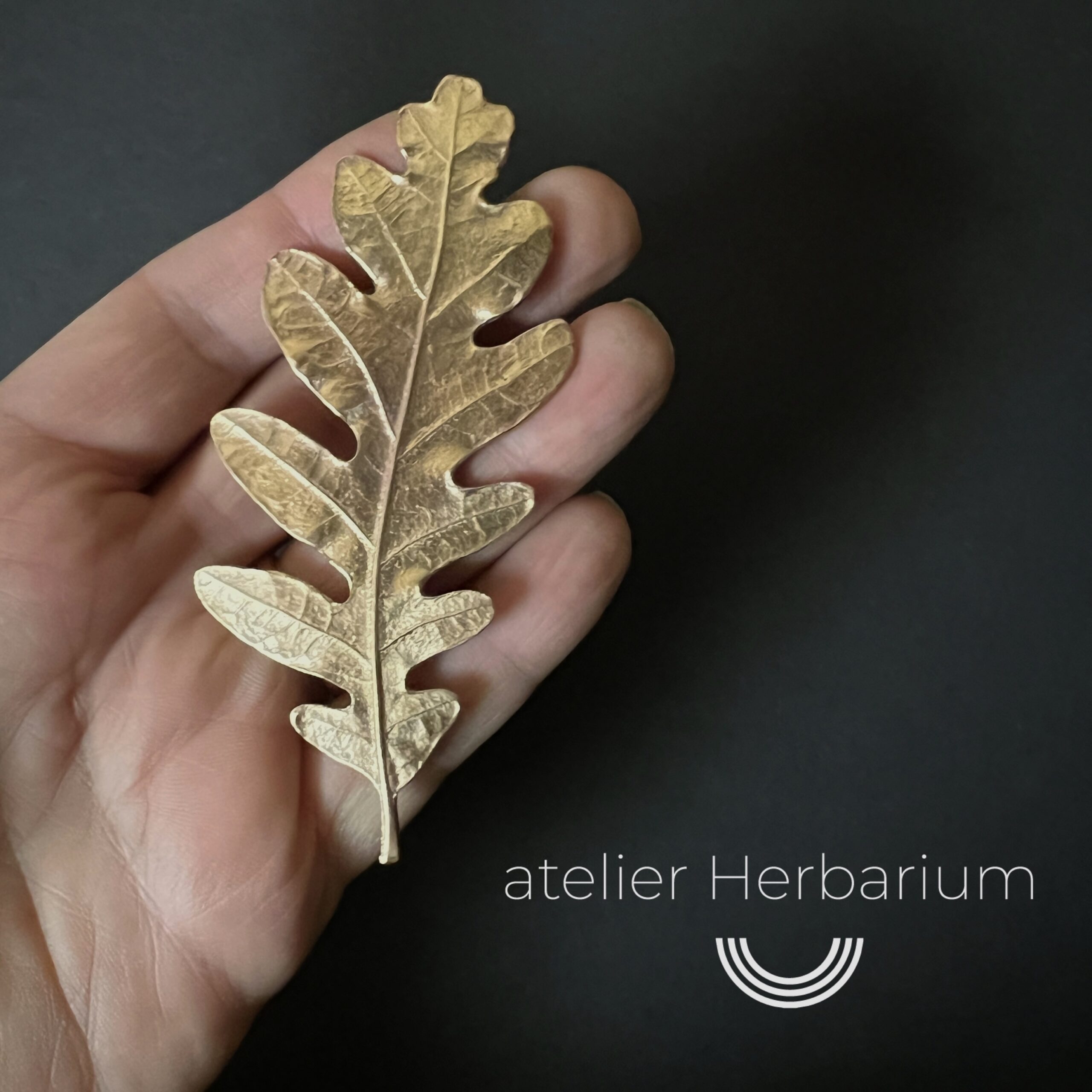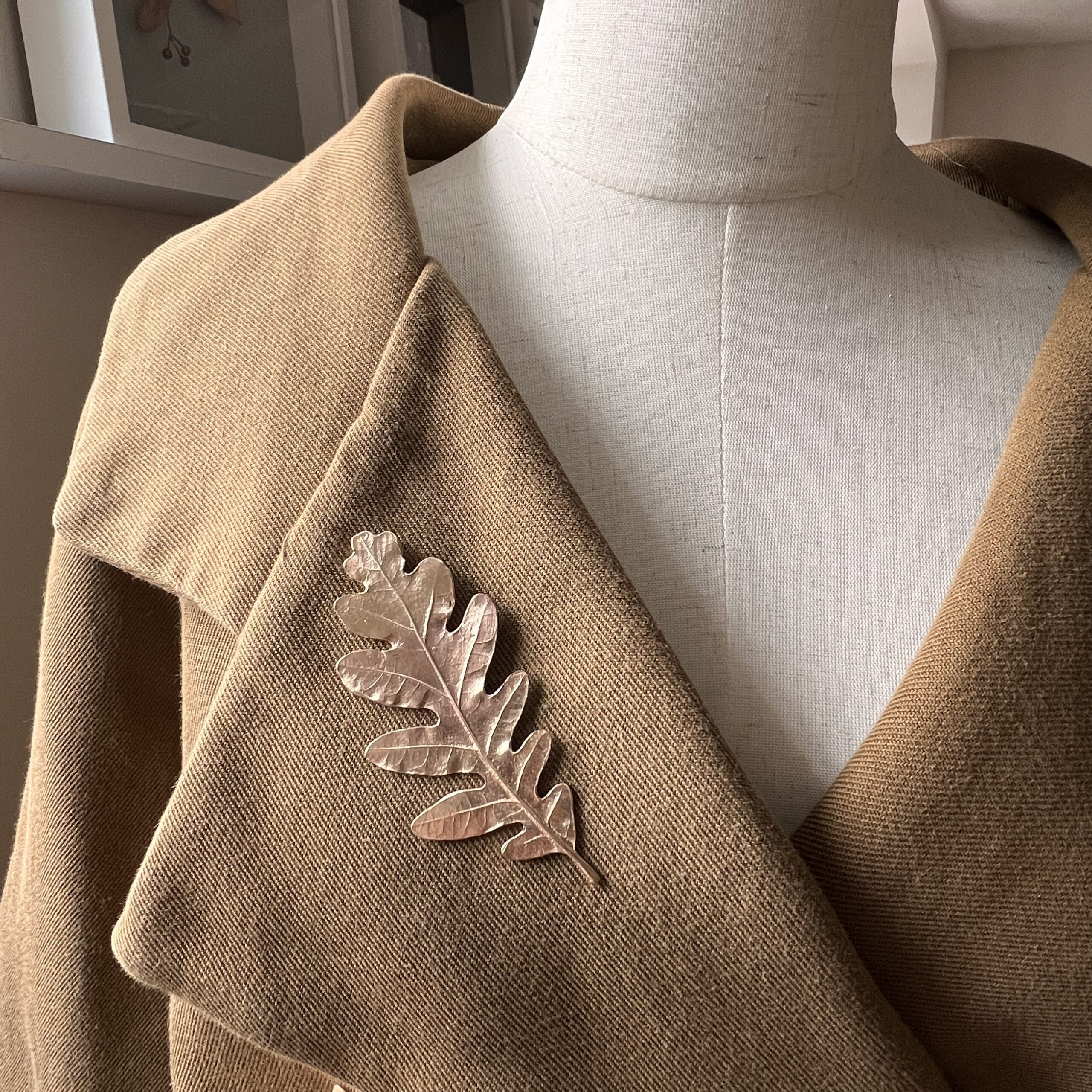 Réplique en bronze d’une feuille de chêne soudée sur un support de pin’s.