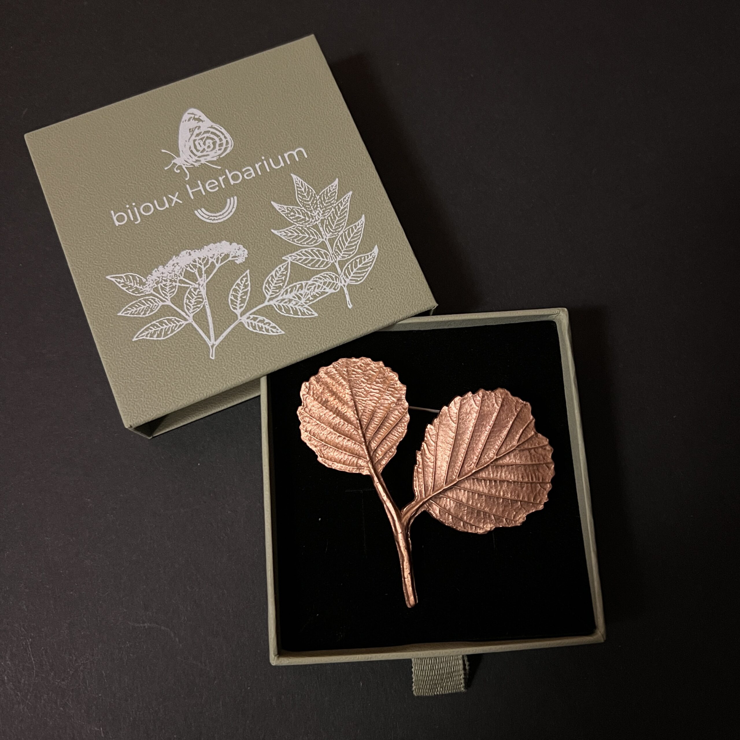 Réplique en bronze d’une branchille de jeunes feuilles de noisetier, montée sur un support de broche.