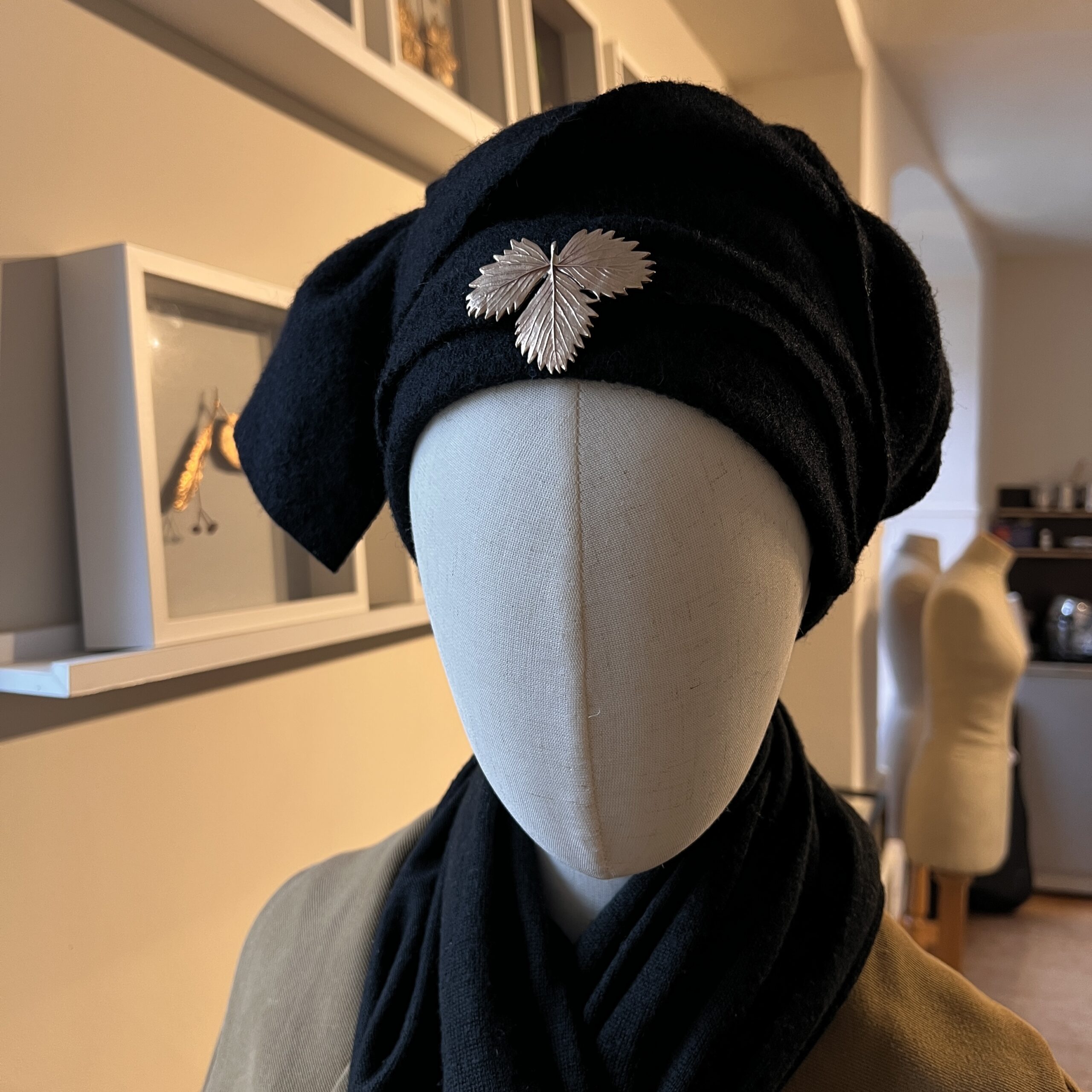 Réplique en bronze d’une feuille de fraise des bois soudée sur un support de pin’s.
