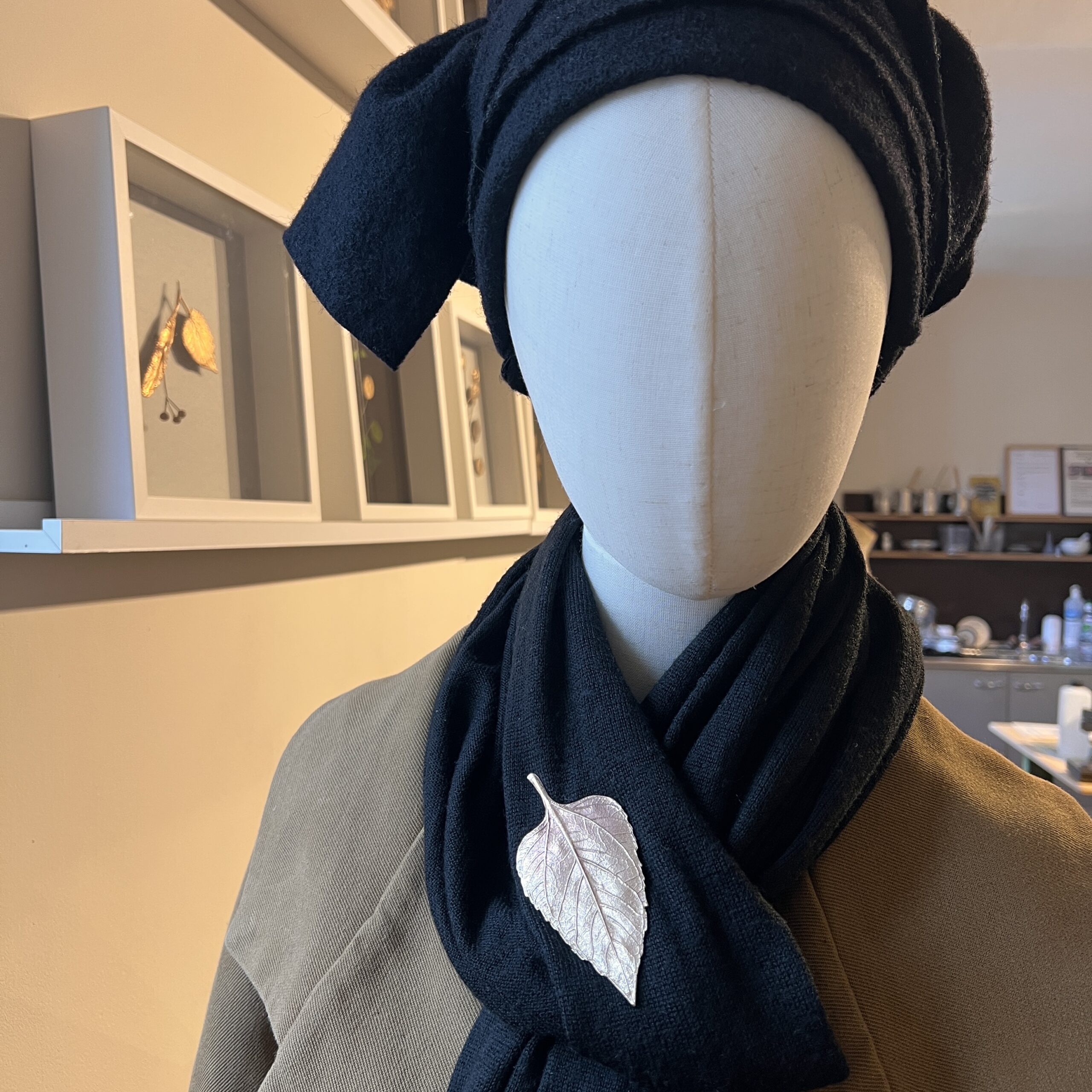 Réplique en bronze d’une feuille de tournesol soudée sur un support de pin’s.