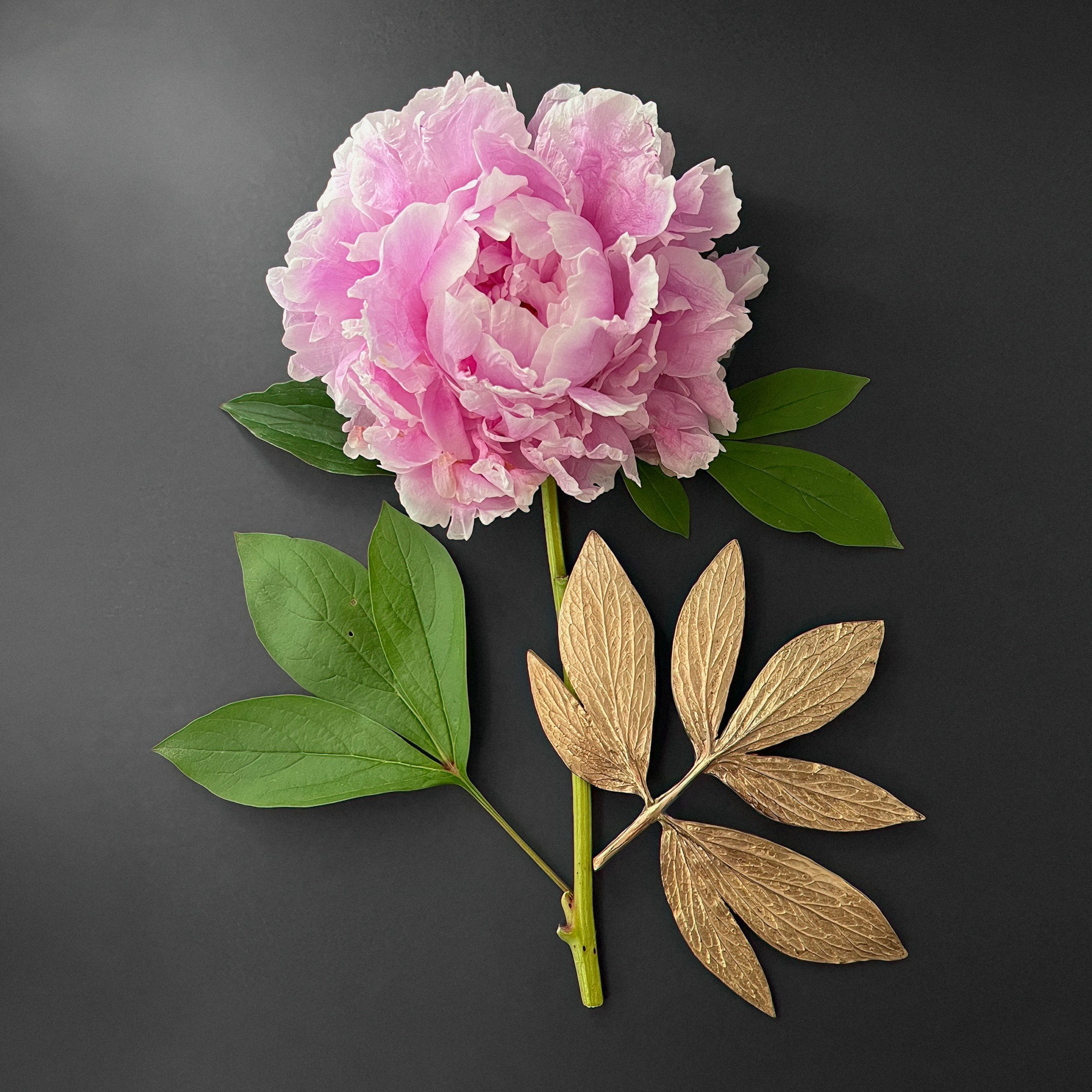 Fleurs, feuilles et répliques en bronze d’Art d’une pivoine. Une composition réalisée et photographiée dans l’esprit des herbiers et des peintures naturalistes de la Renaissance.