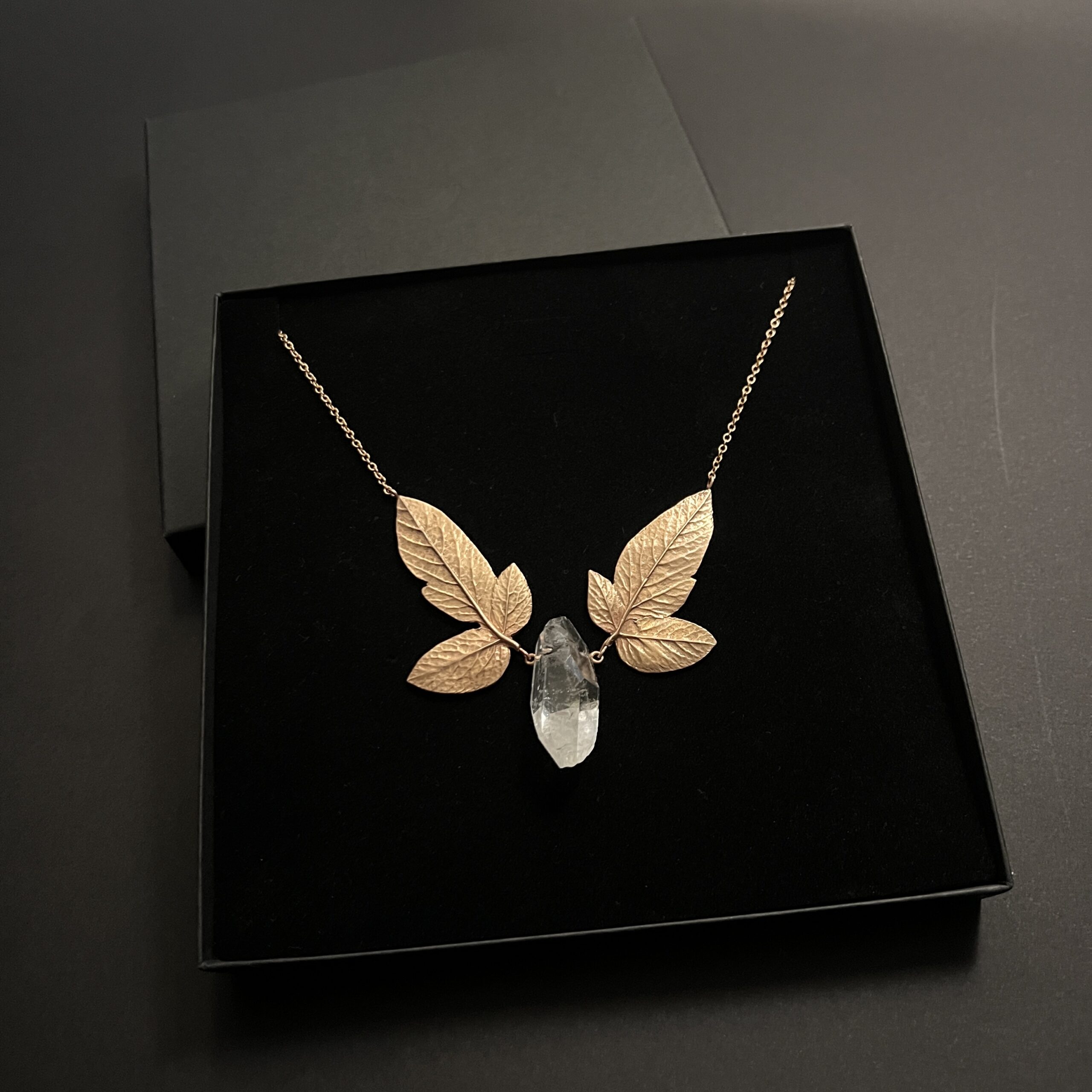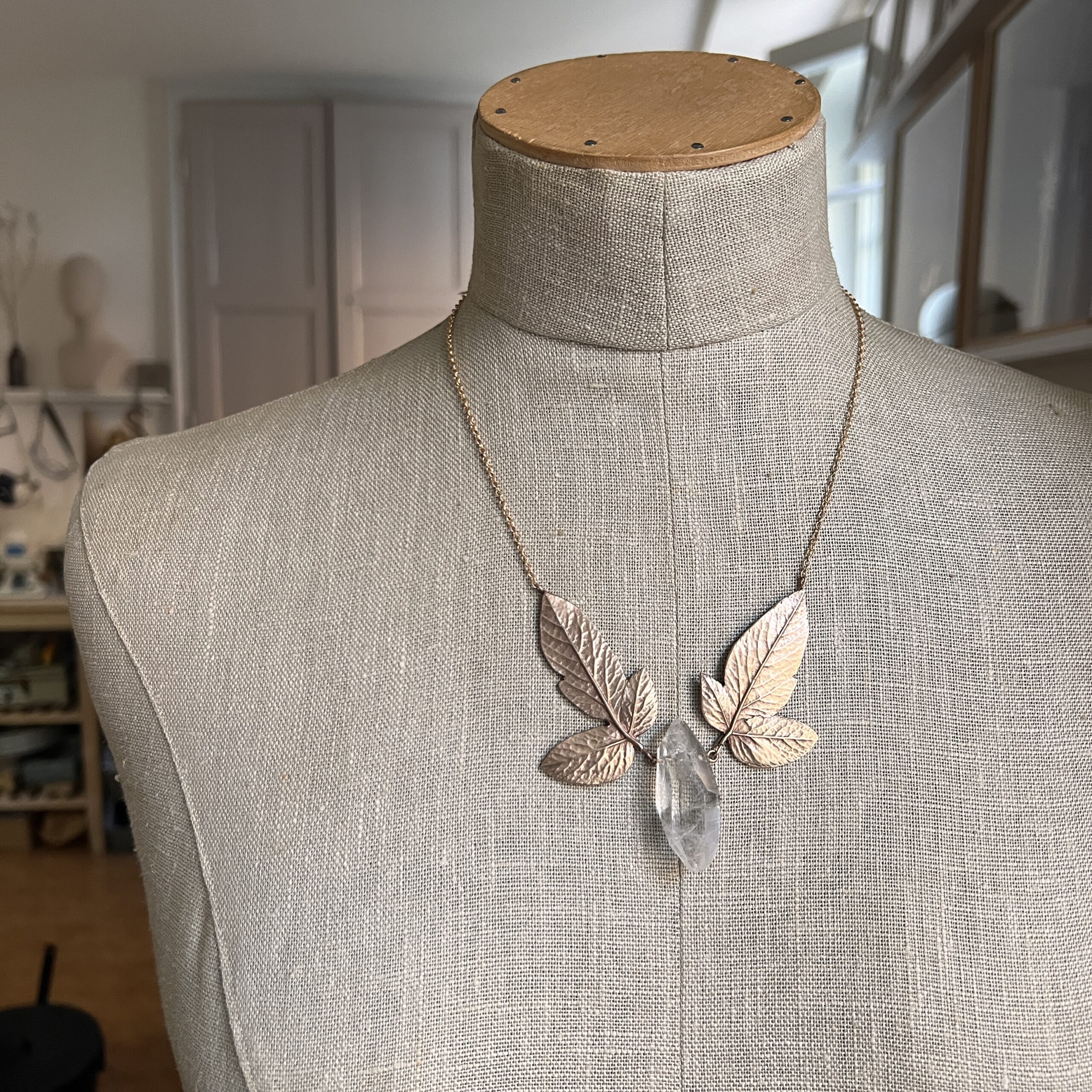 Collier composé de répliques en bronze d’art de folioles d’égopode et d’un pendentif en cristal de roche à facette; rappelant le corps d’un papillon surmonté d’ailes végétales. Cette pièce unique est montées sur une fine chainette en bronze agrémentée d’un fermoir et d’un ajout permettant de varier la longueur du collier.
