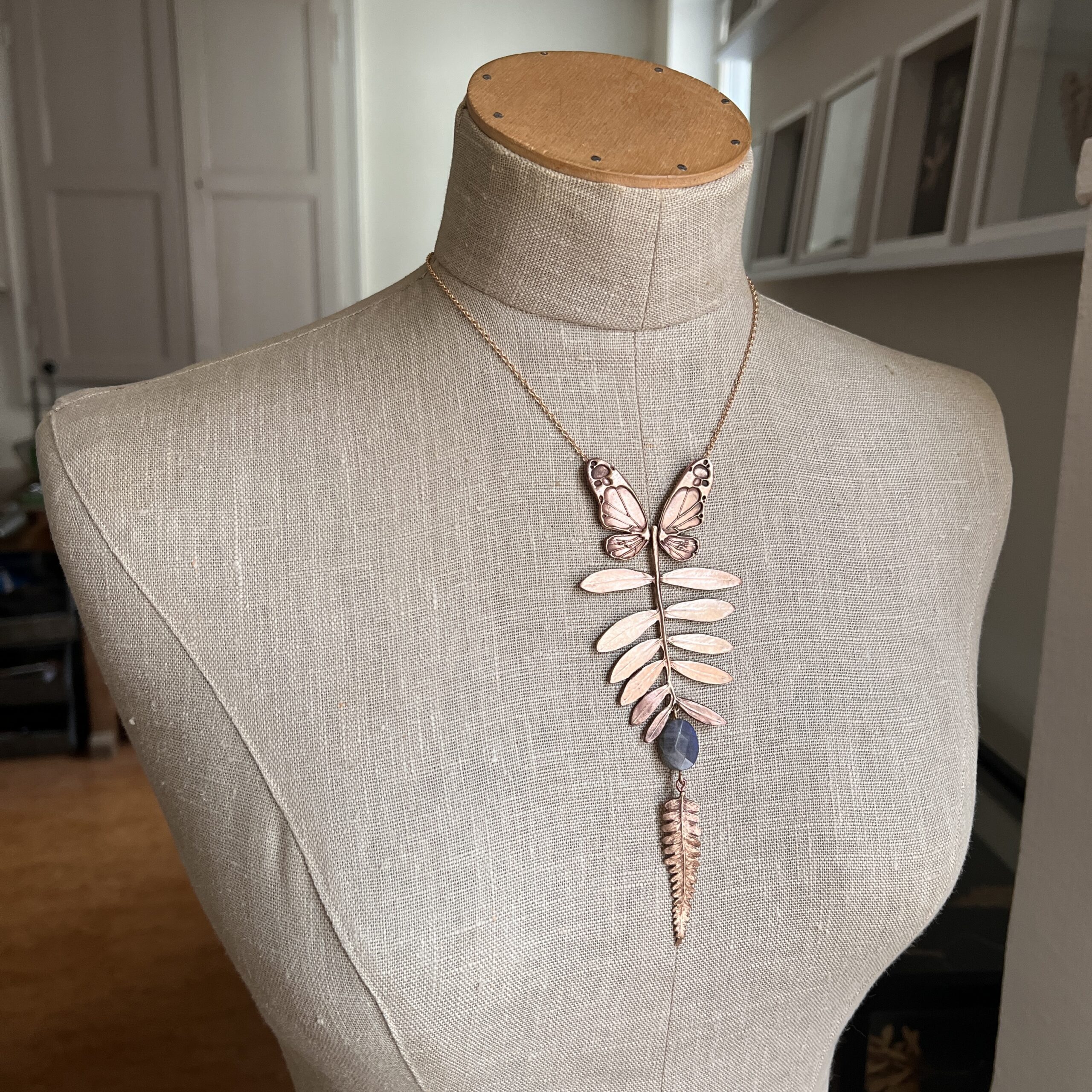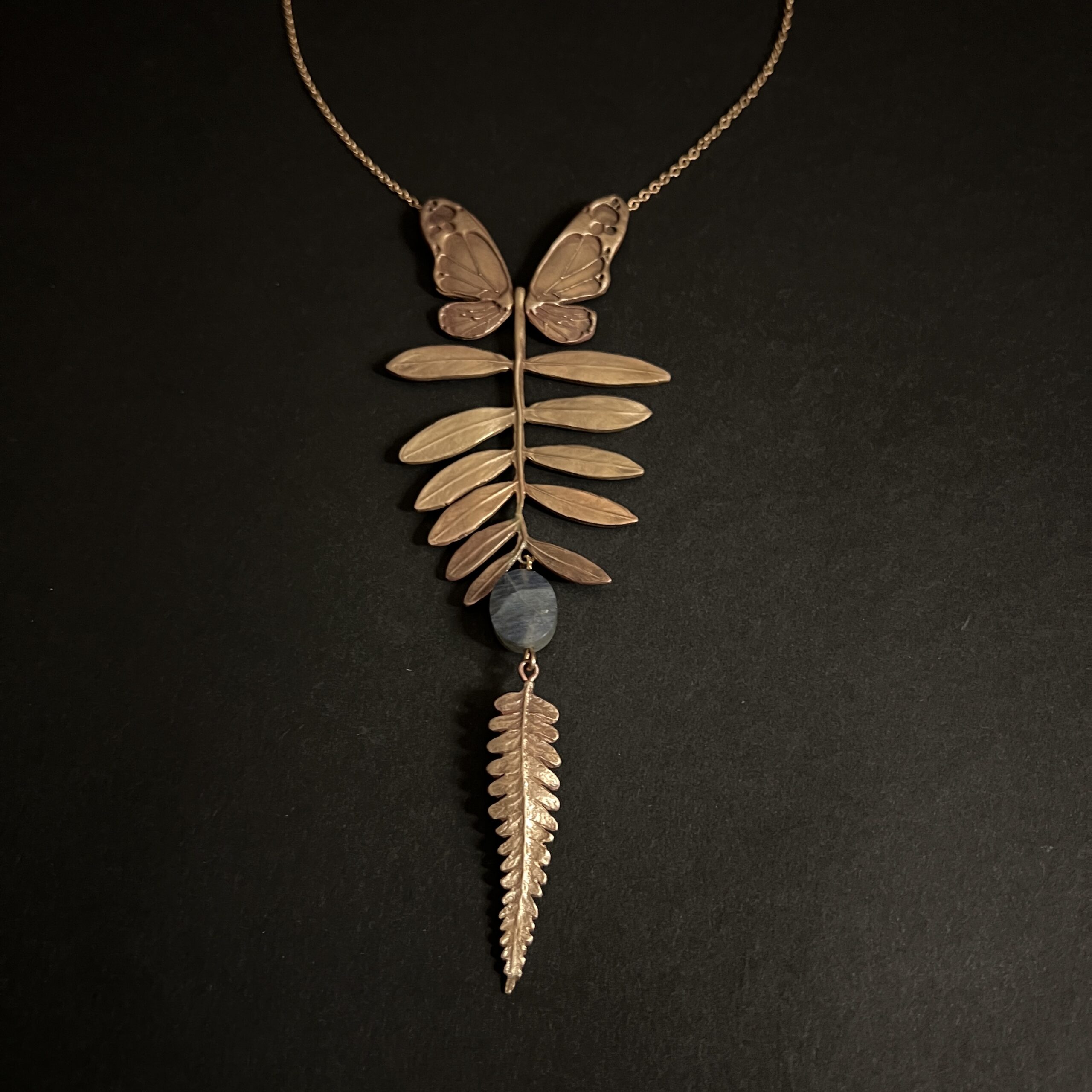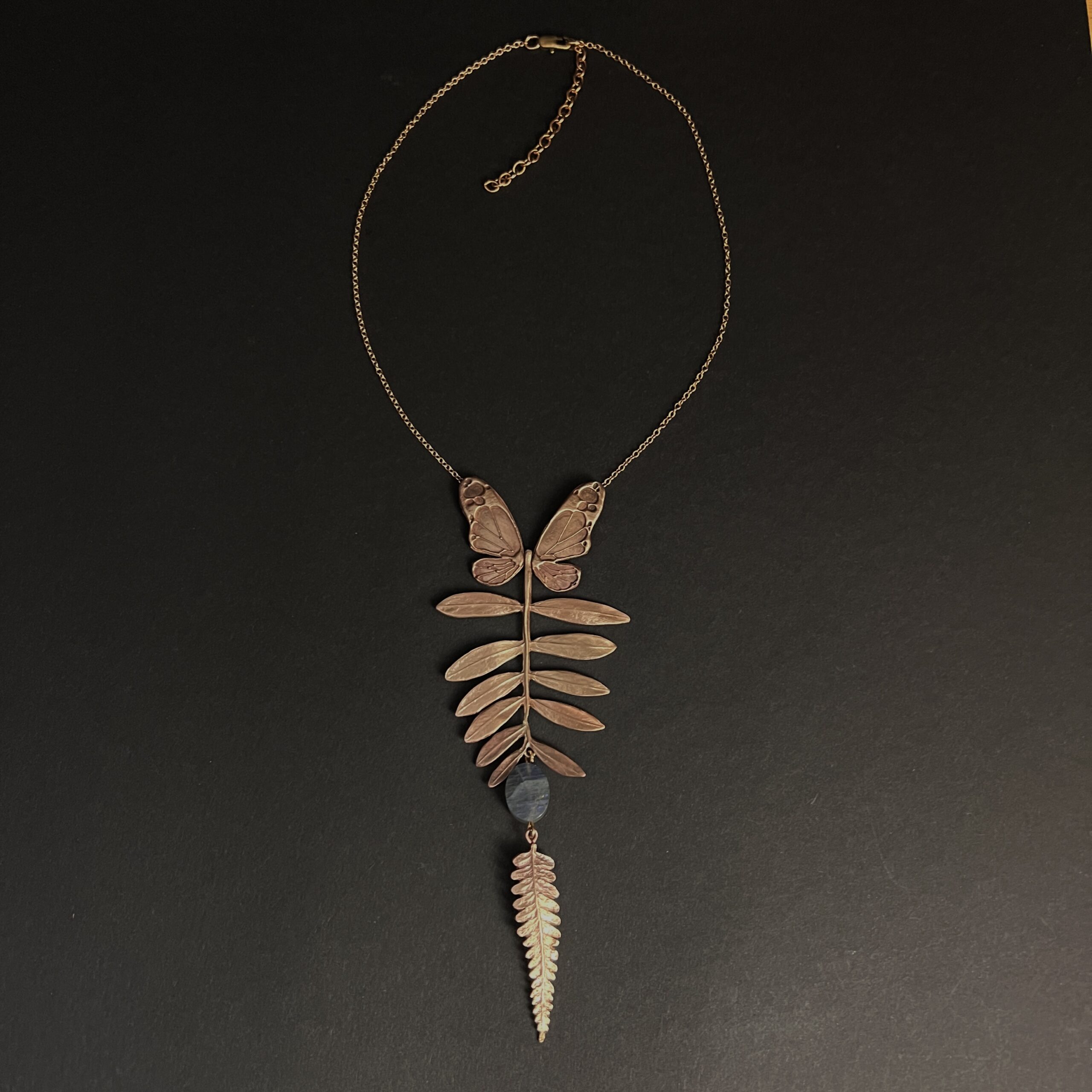 Un collier-totem célébrant la poésie du végétal, du minéral et de l’animal alliant bronze et labradorite.