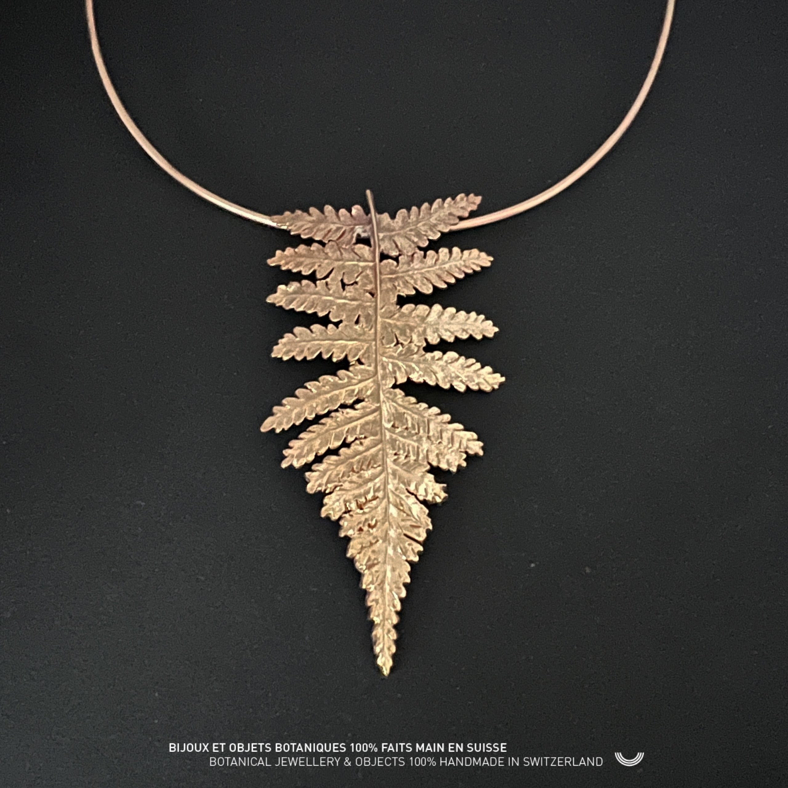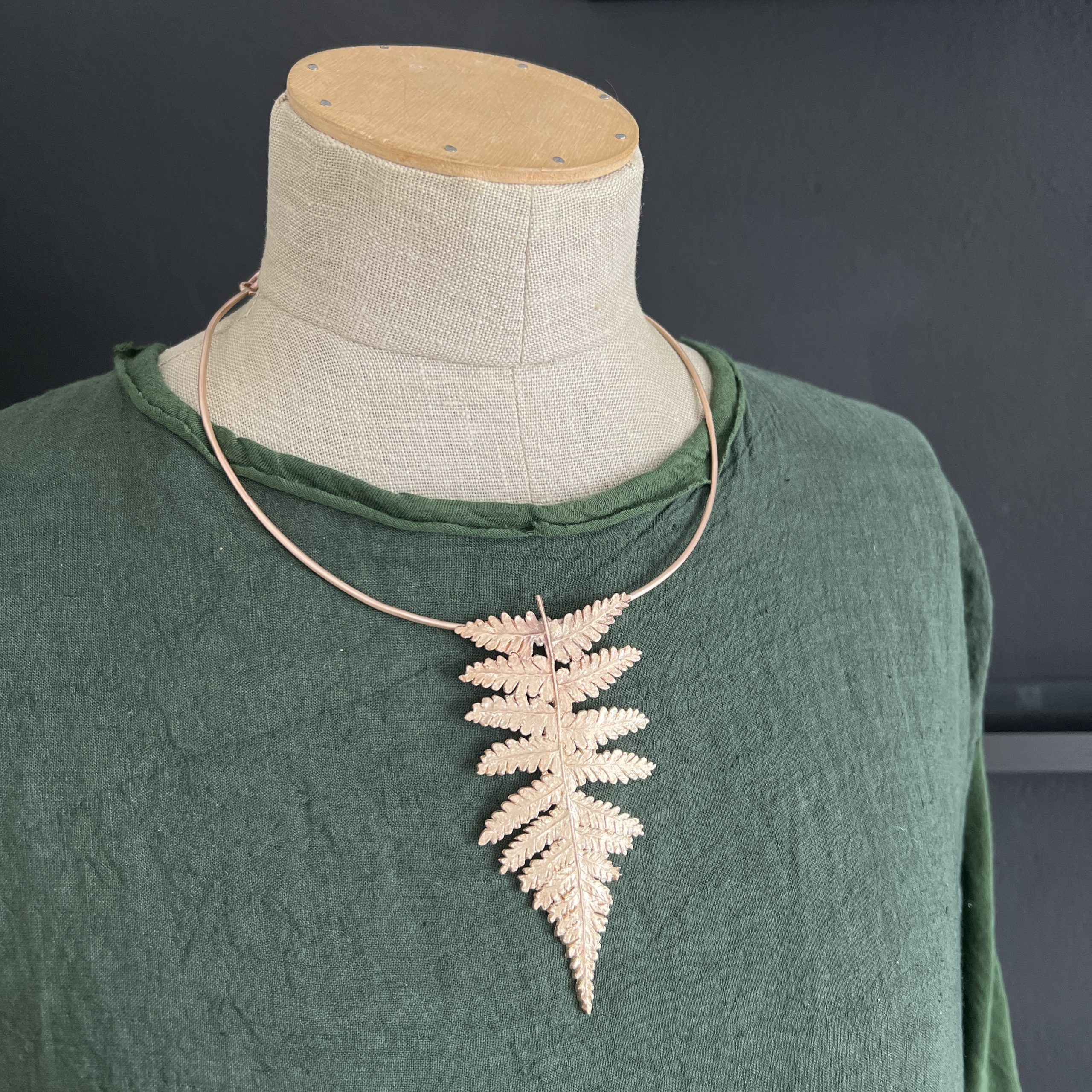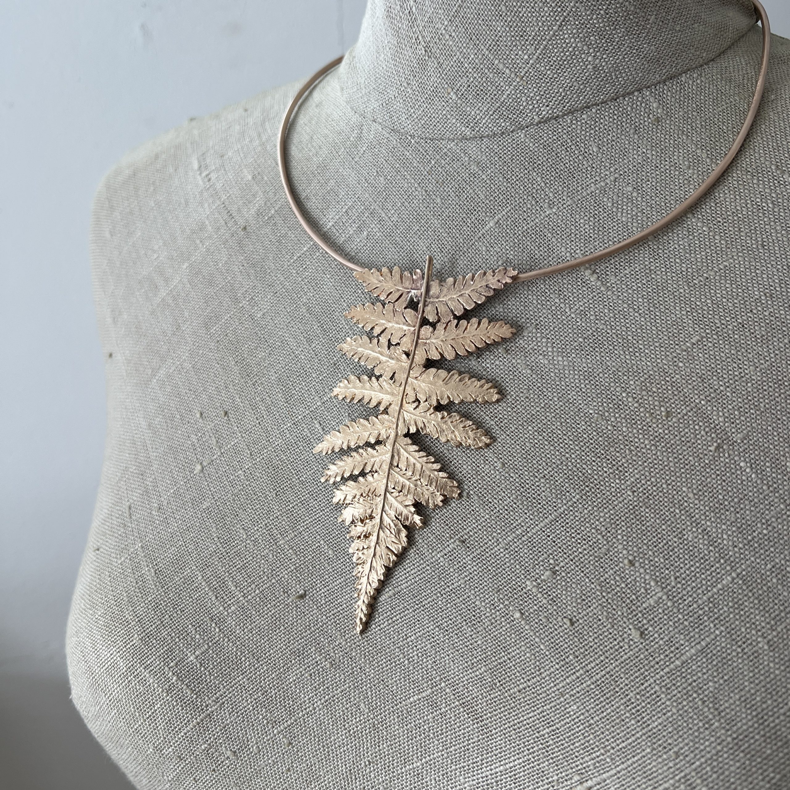 Répliques d’une foliole de fougère. Collier-torque réglable en bronze d’art.