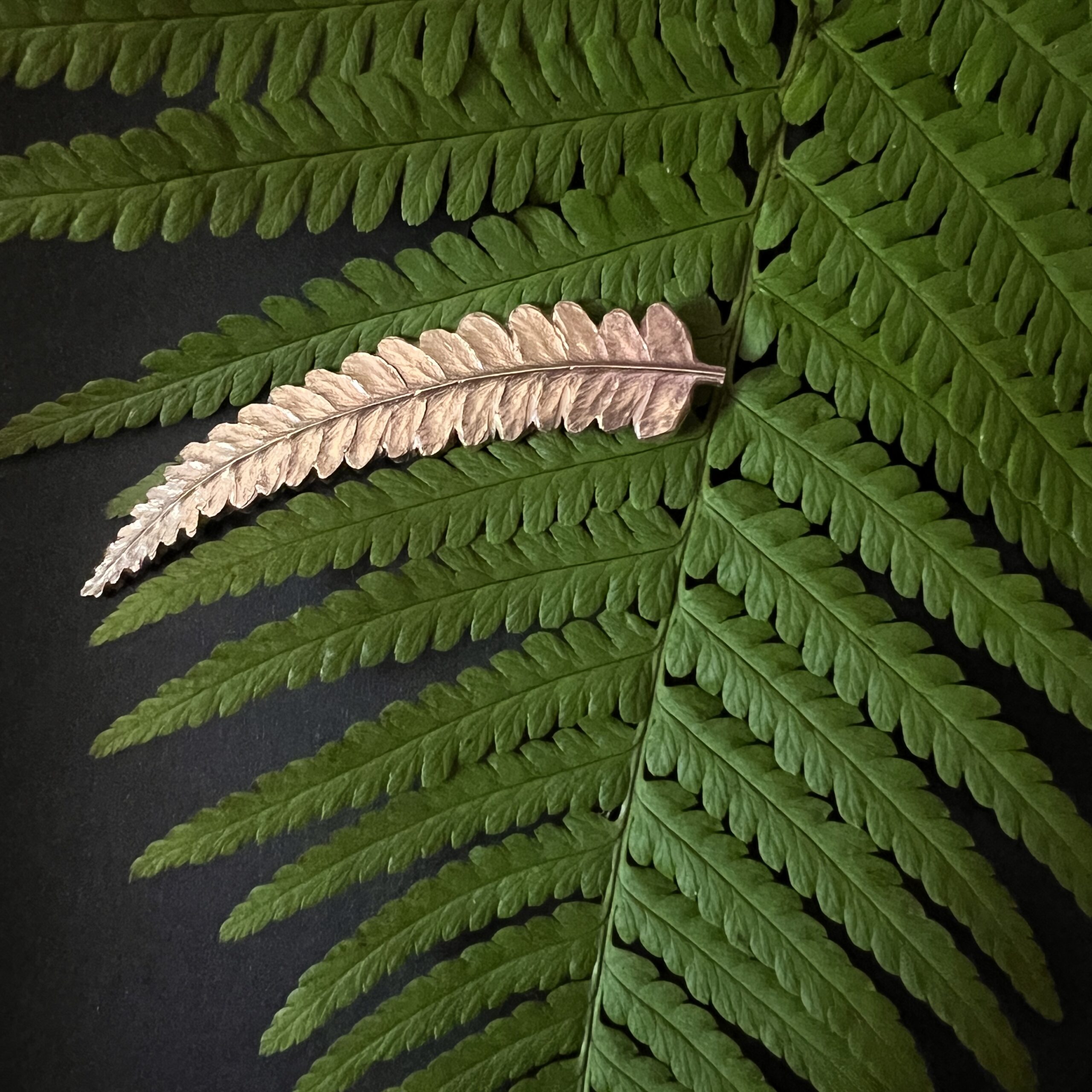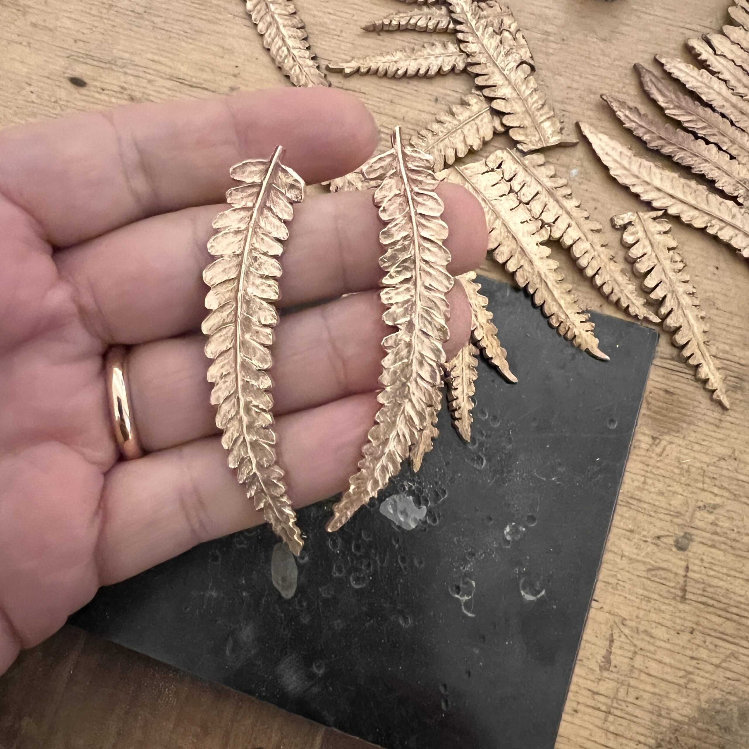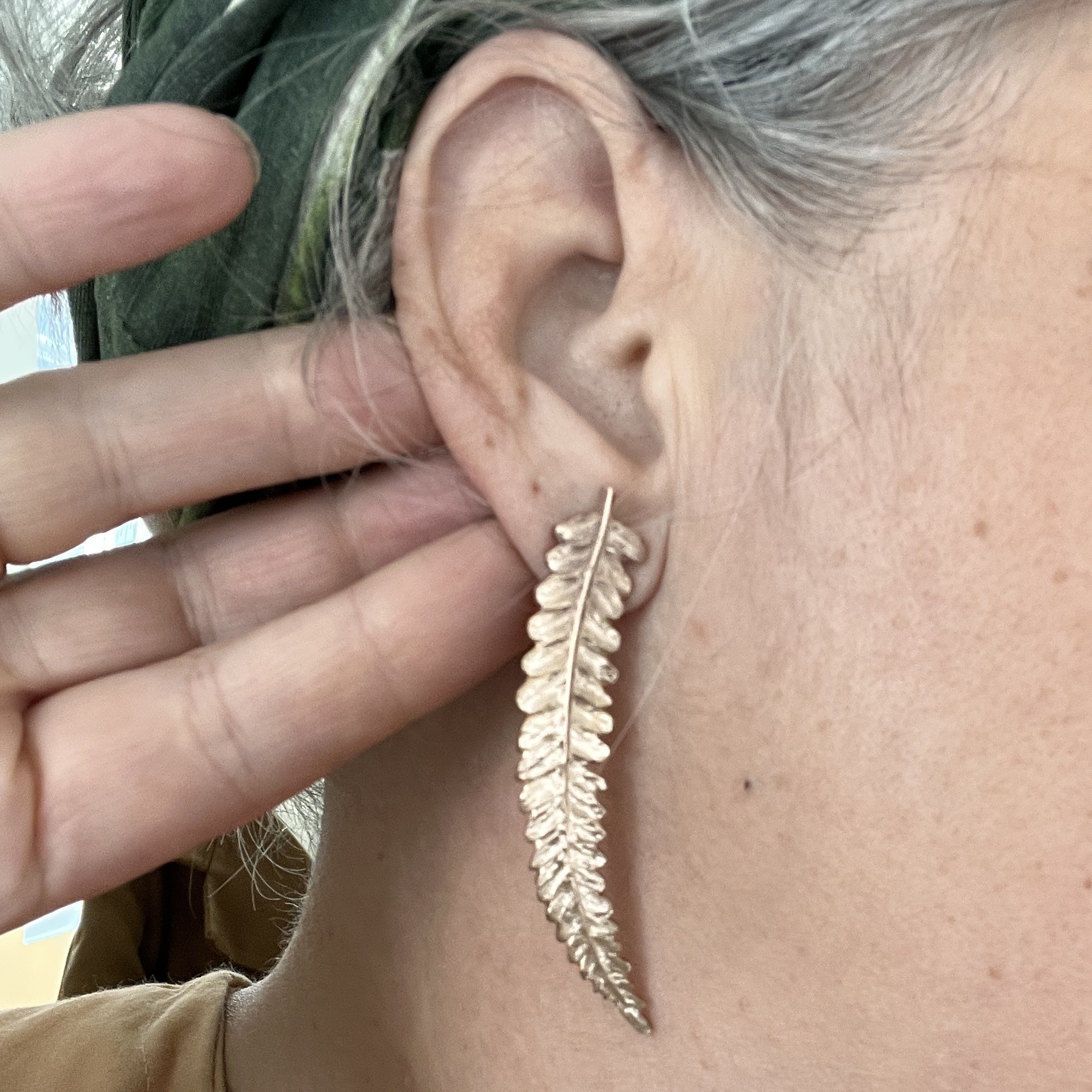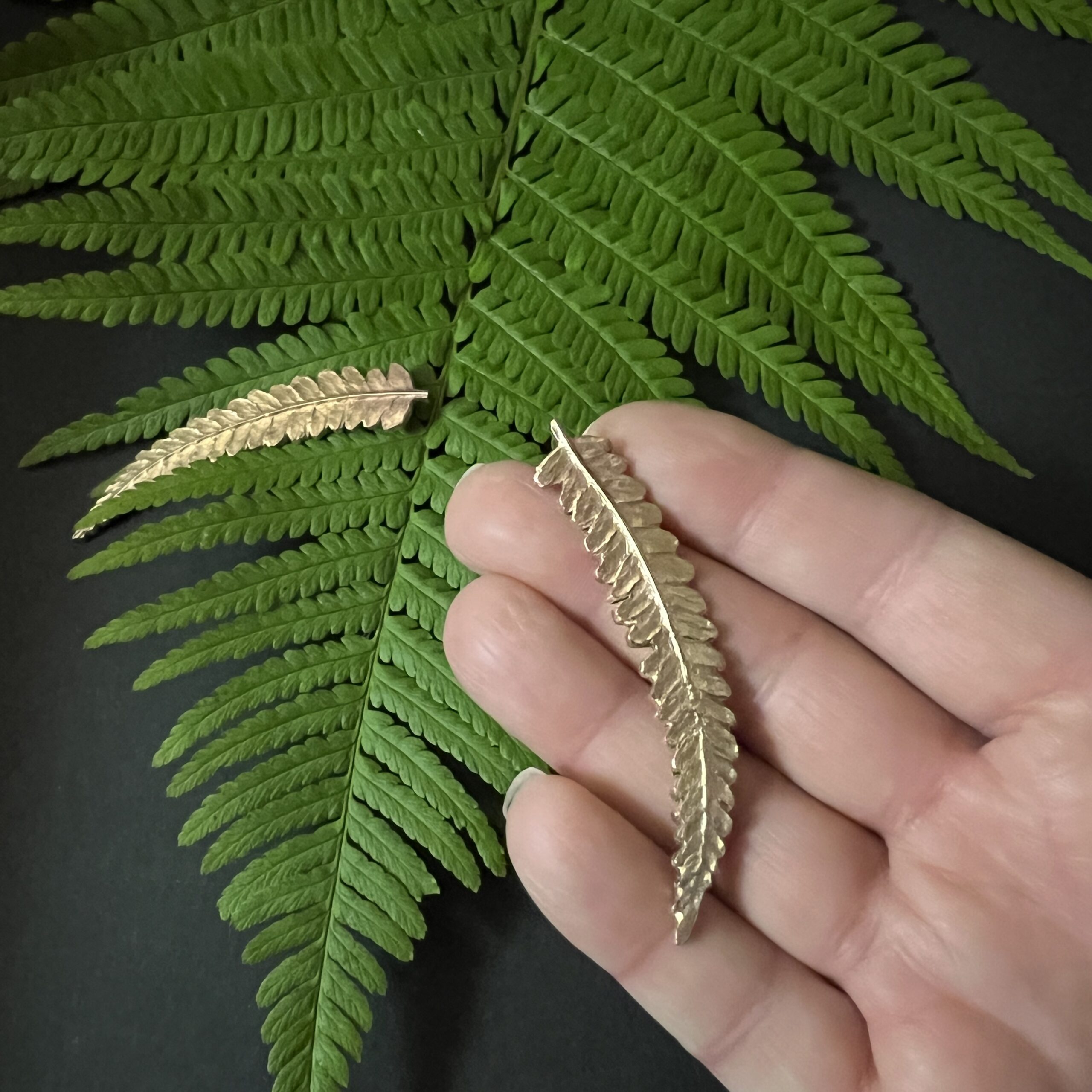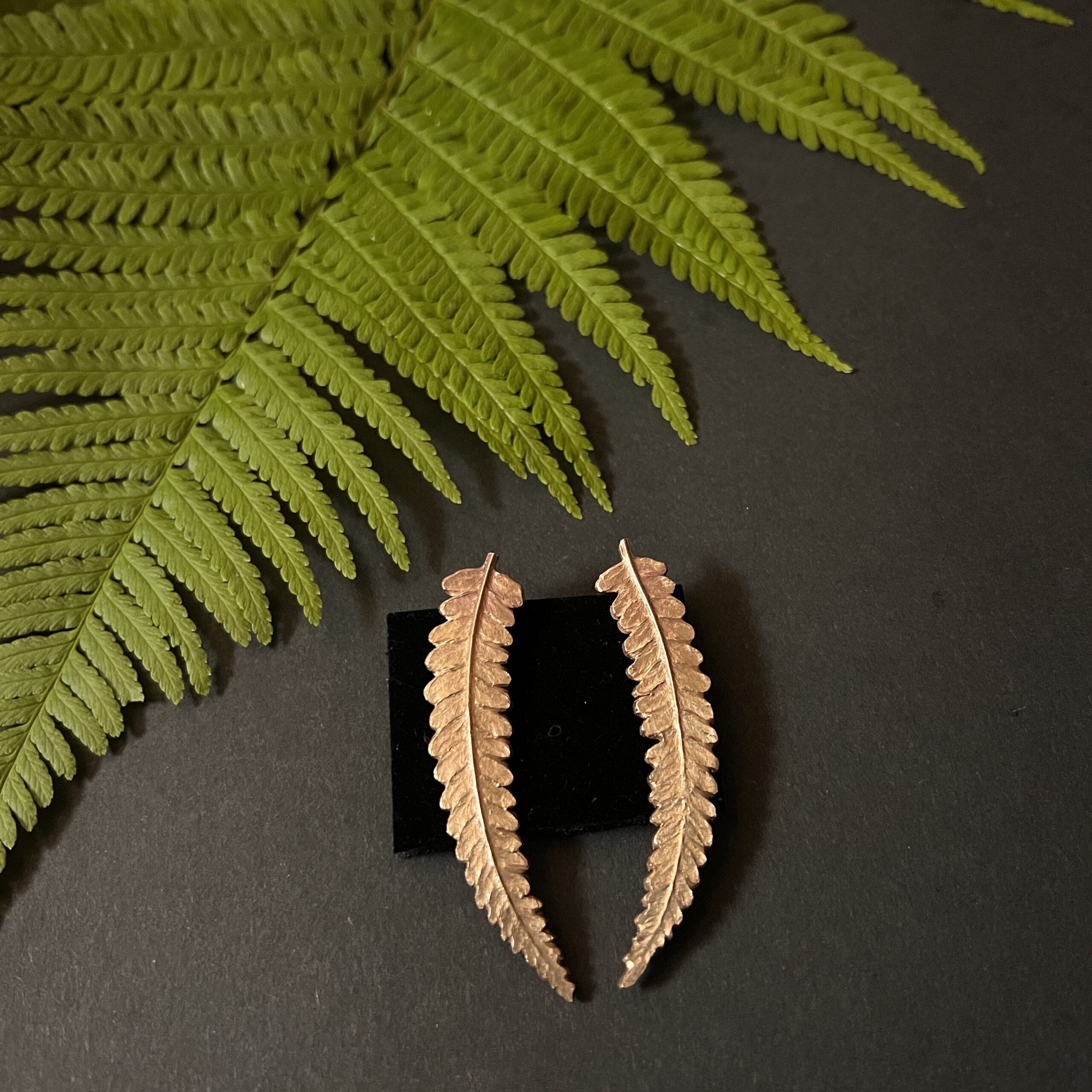 Répliques en bronze de feuilles de folioles de fougère soudées sur des clous d’oreilles en argent 925.