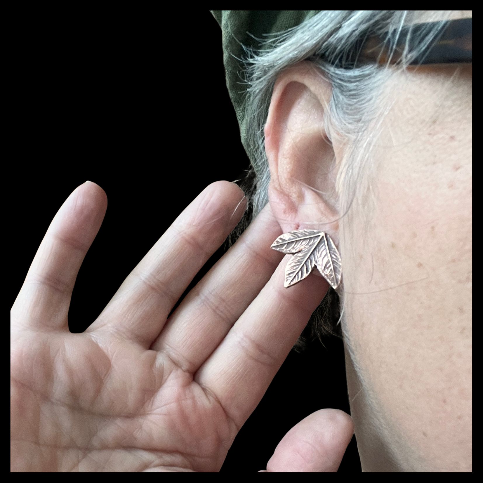 Folioles de roser sauvage en bronze, finement sculptées en bronze d’art et soudées sur des clous d’oreilles en argent 925.