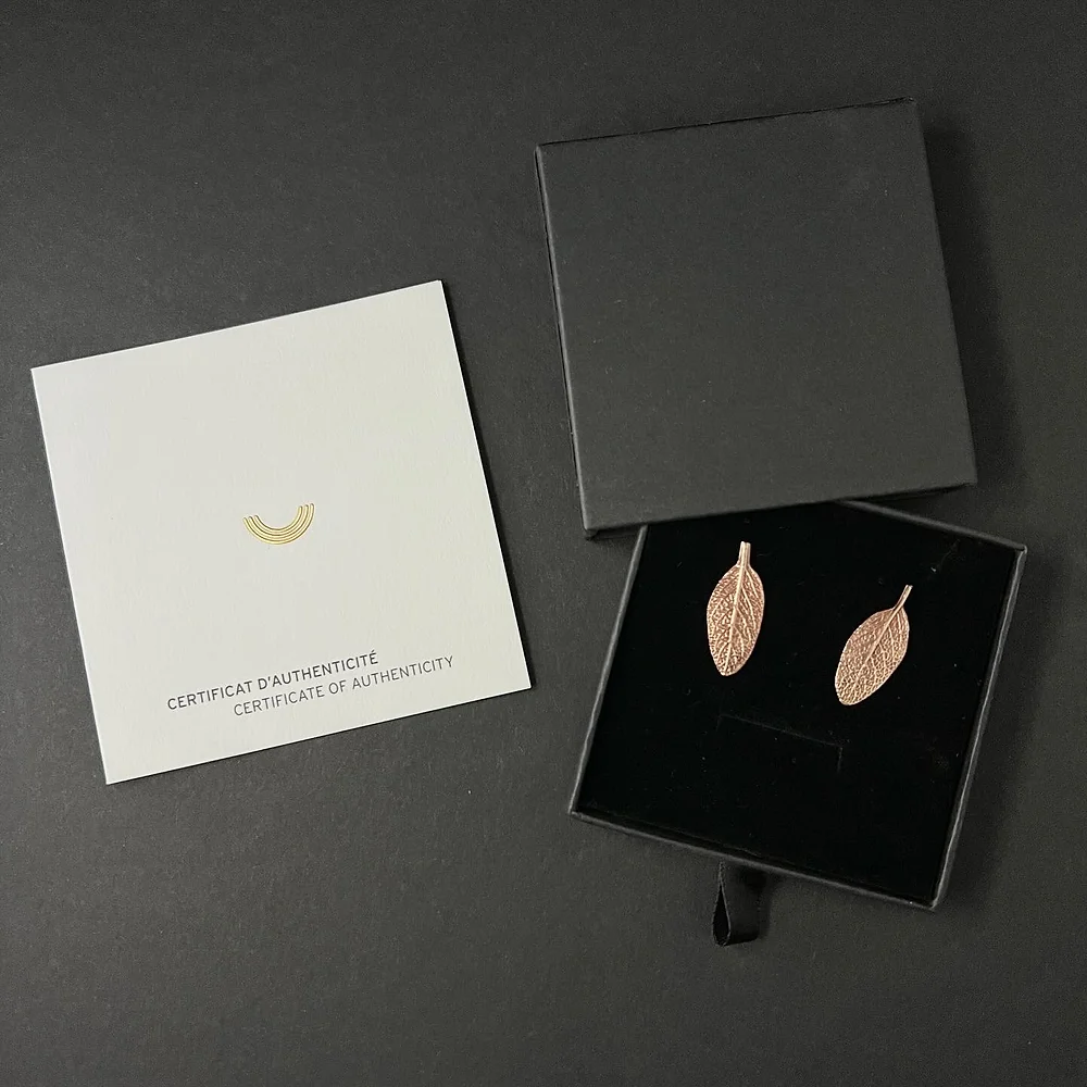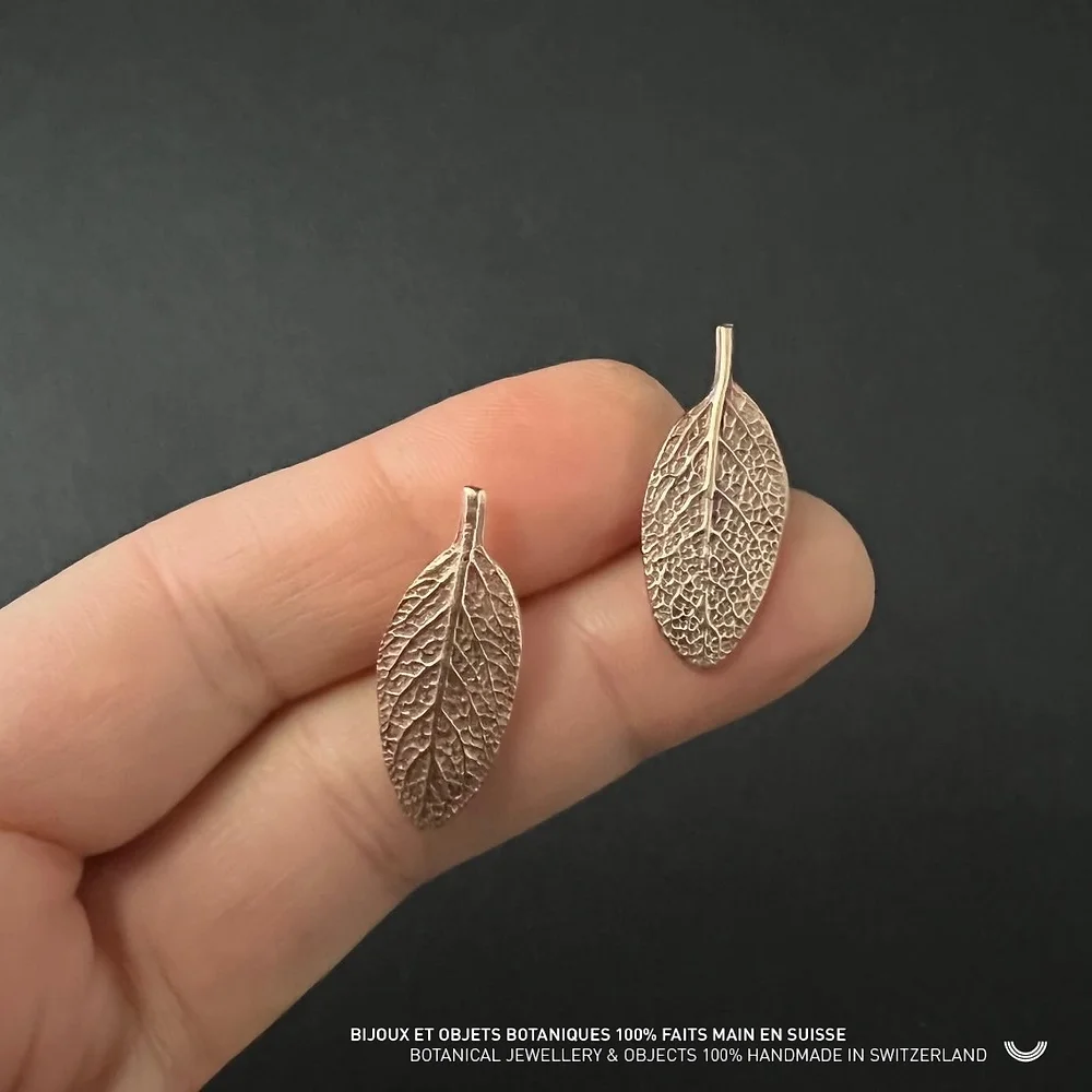 Répliques en bronze ou en argent 925 de feuilles de sauge officinales soudées sur des clous d’oreilles en argent 925.