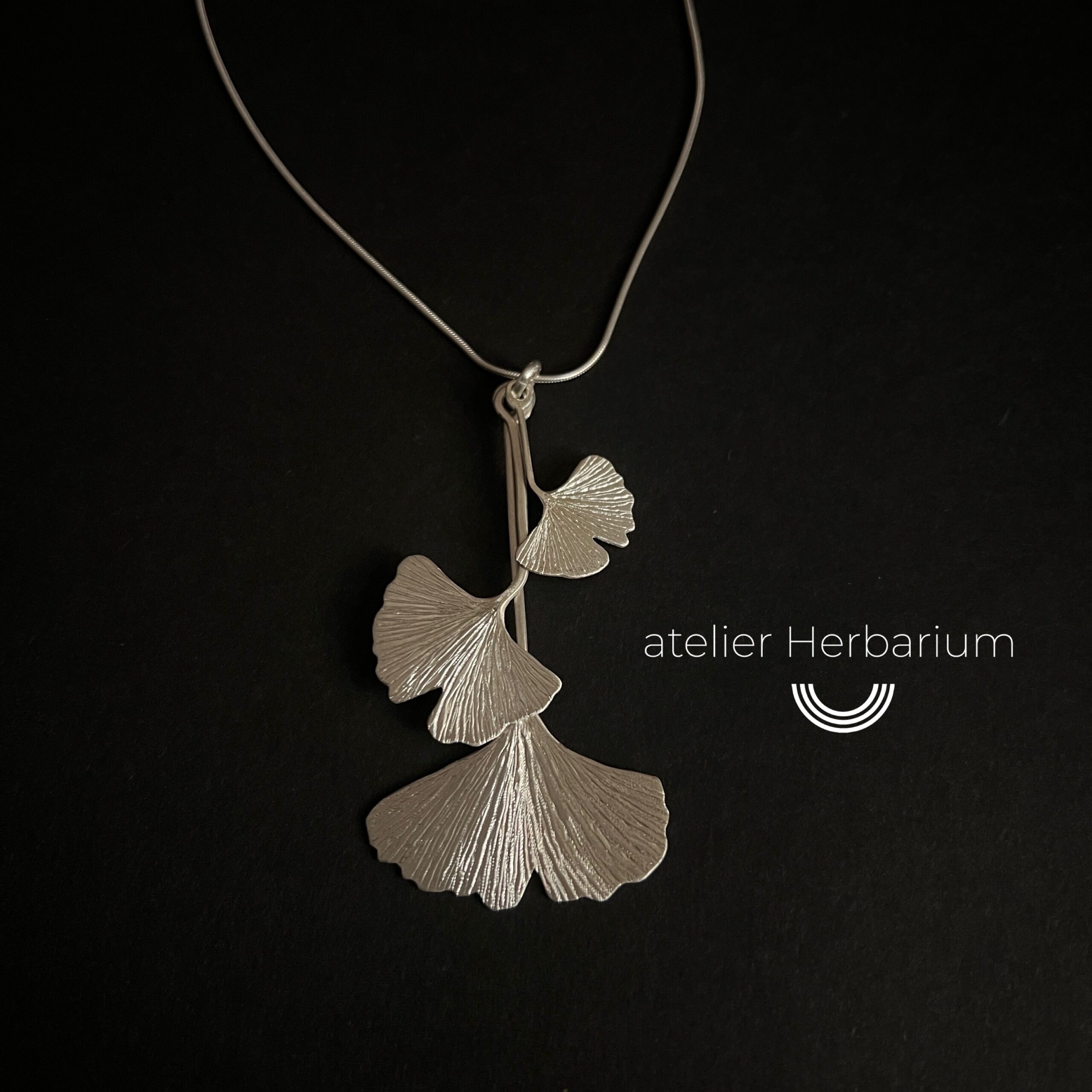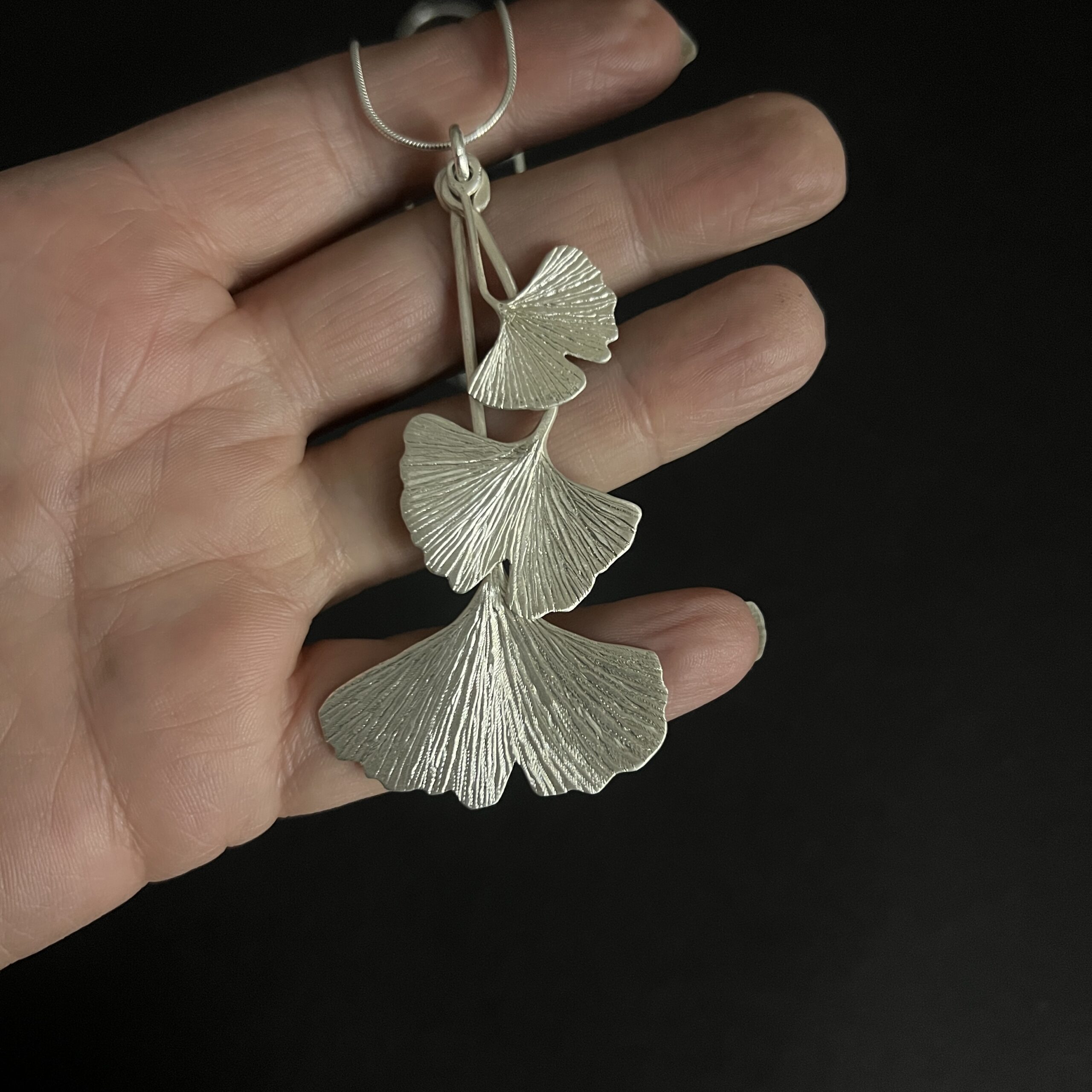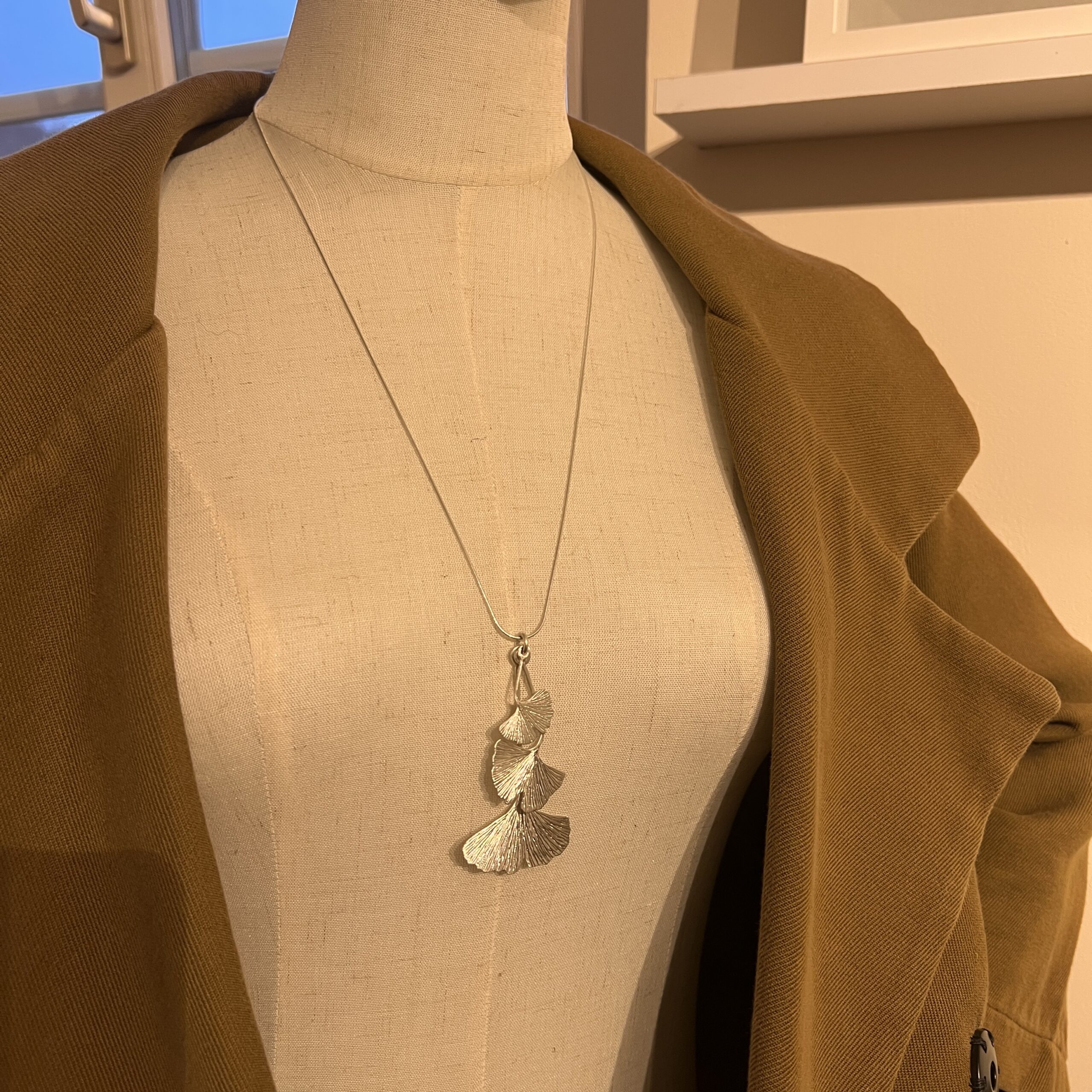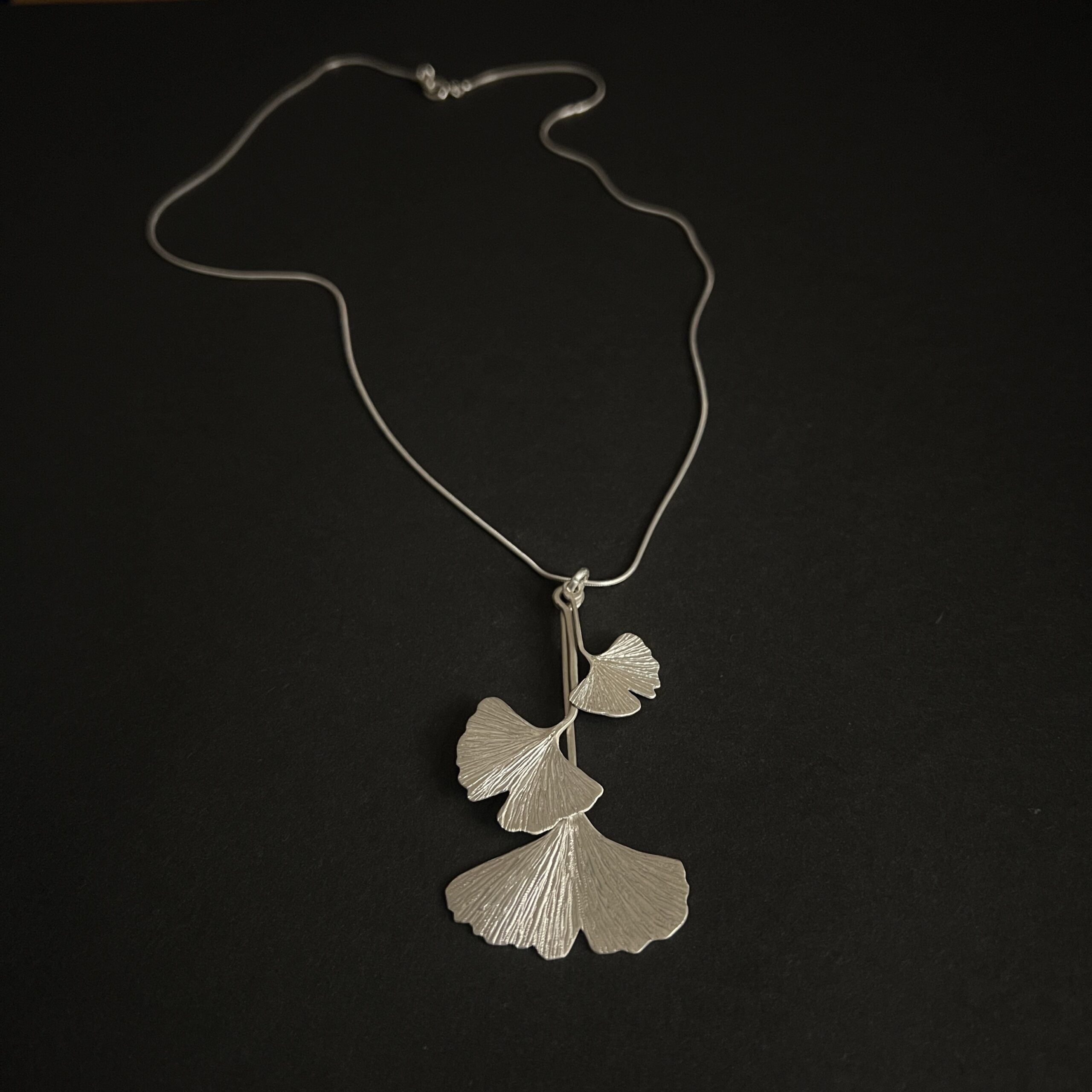 Sautoir en argent 925 composé de trois feuilles de ginkgo en pendentif montées sur une chaine serpent.