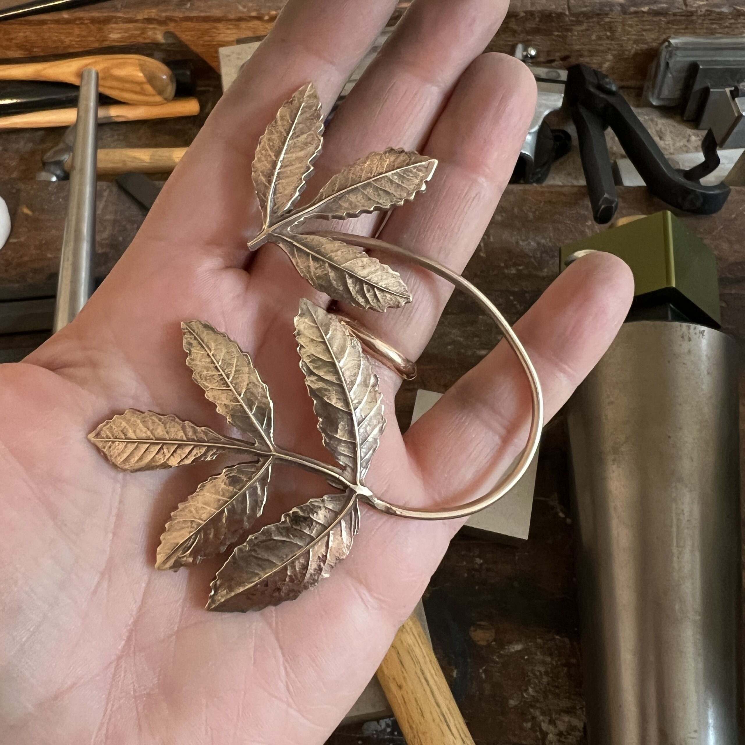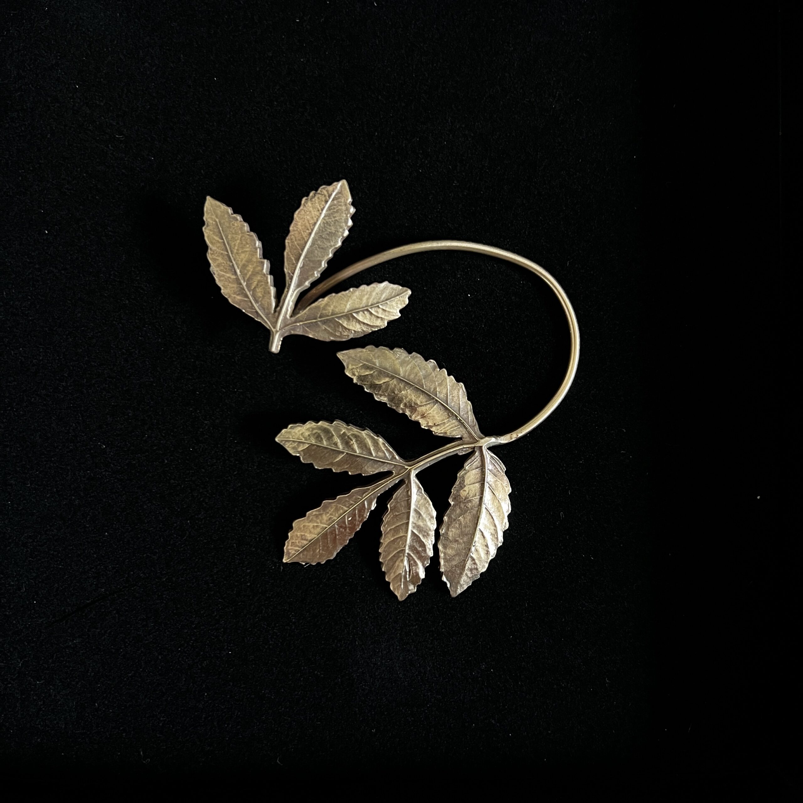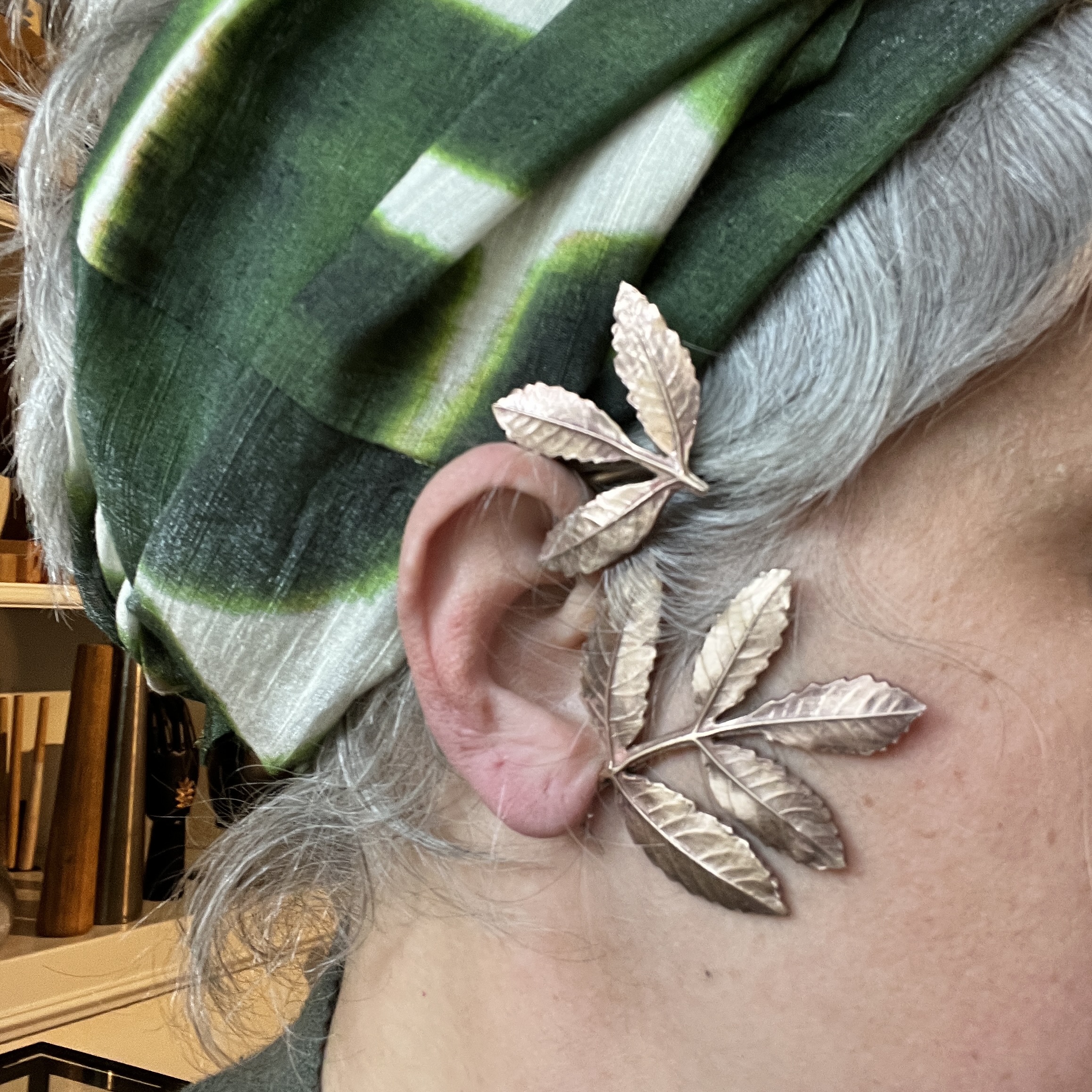 Répliques de feuilles de frêne en bronze d’art. Tour d’oreille ne nécessitant pas de trou. Il suffit de l’enfiler à l’arrière de l’oreille, de faire ressortir le lobe et de glisser le bijou afin que la feuille se cale sur le haut de votre oreille (voir photo).